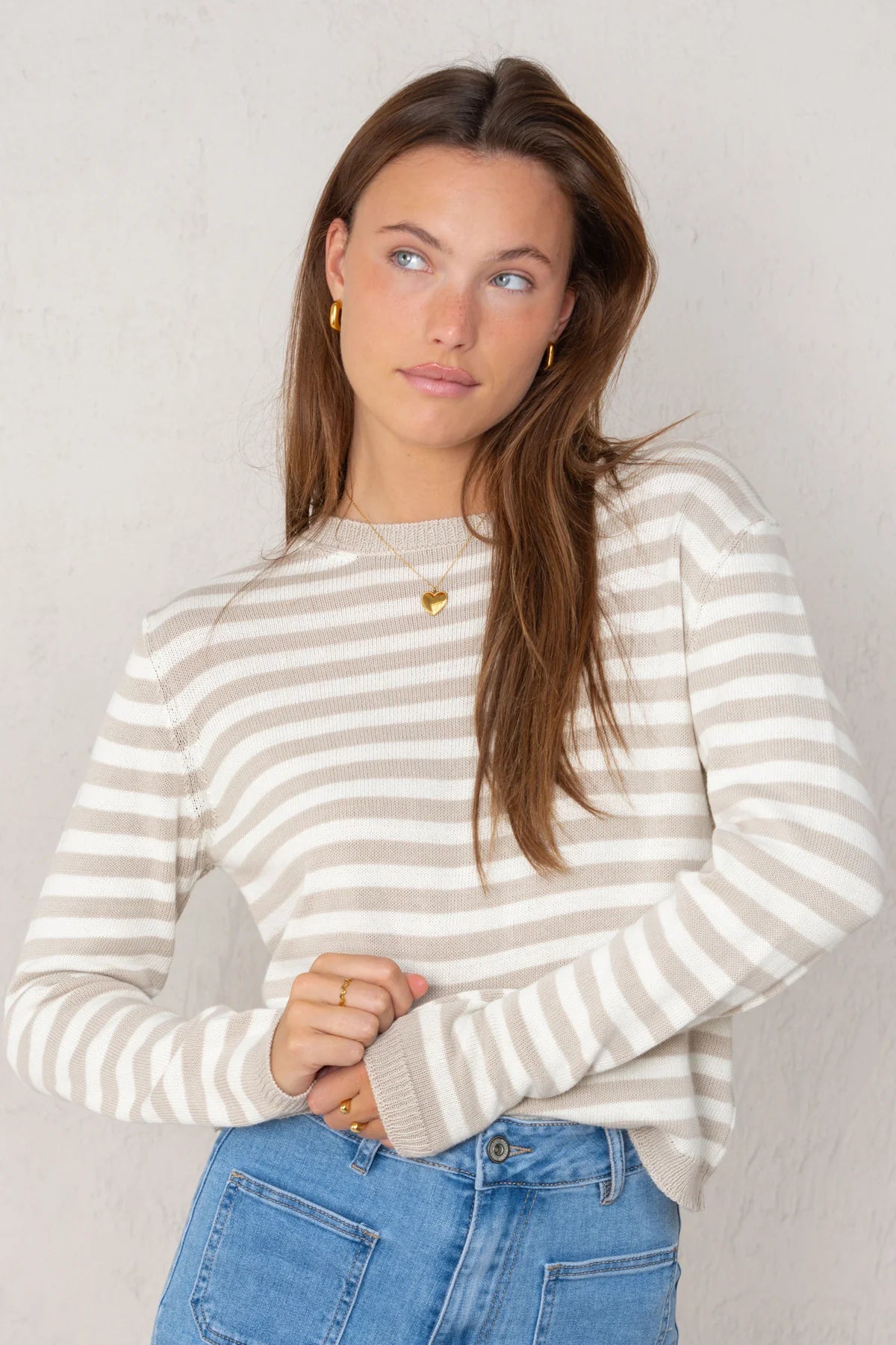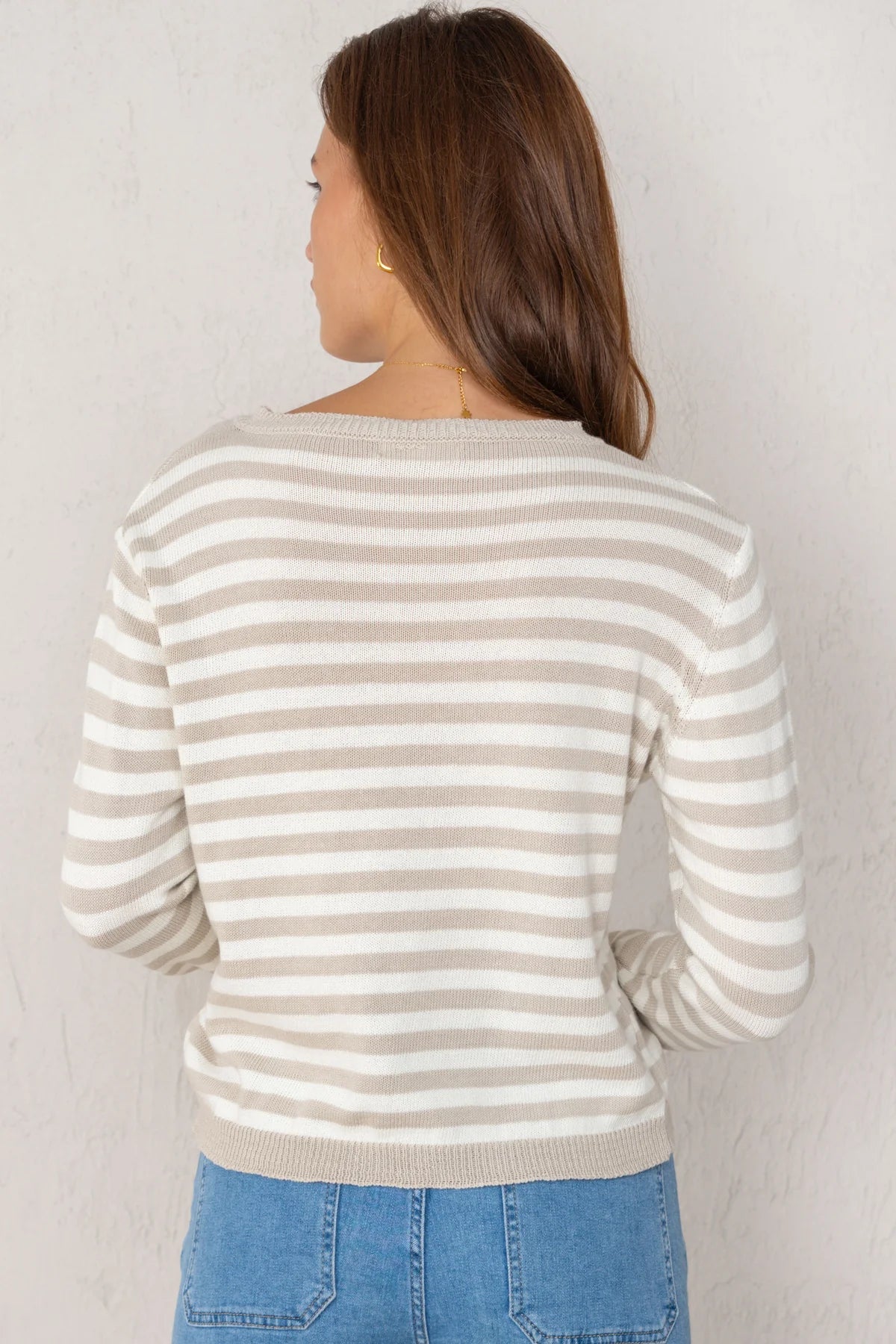 Striped knit sweater with a ribbed round neckline and long sleeves with ribbed cuffs.