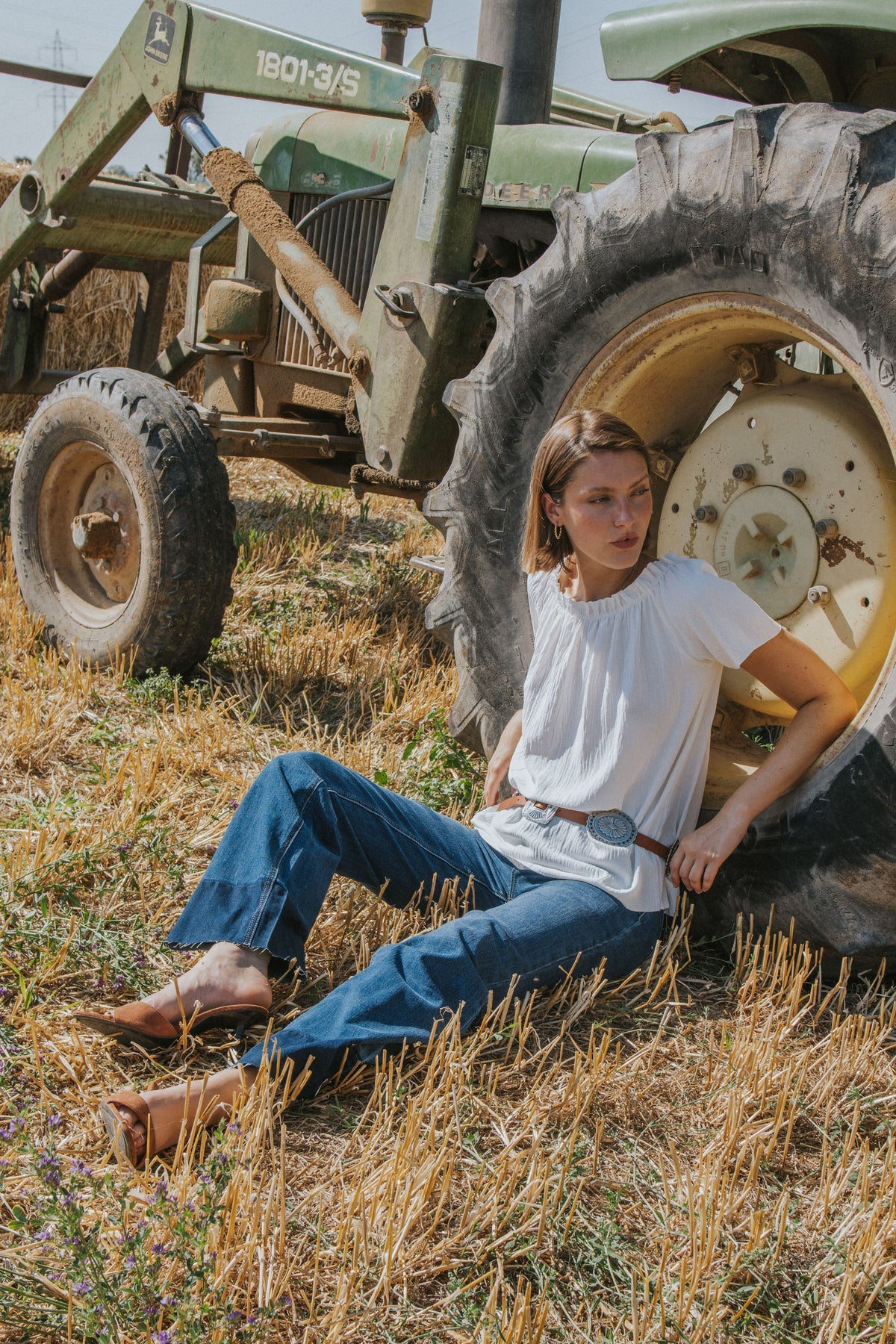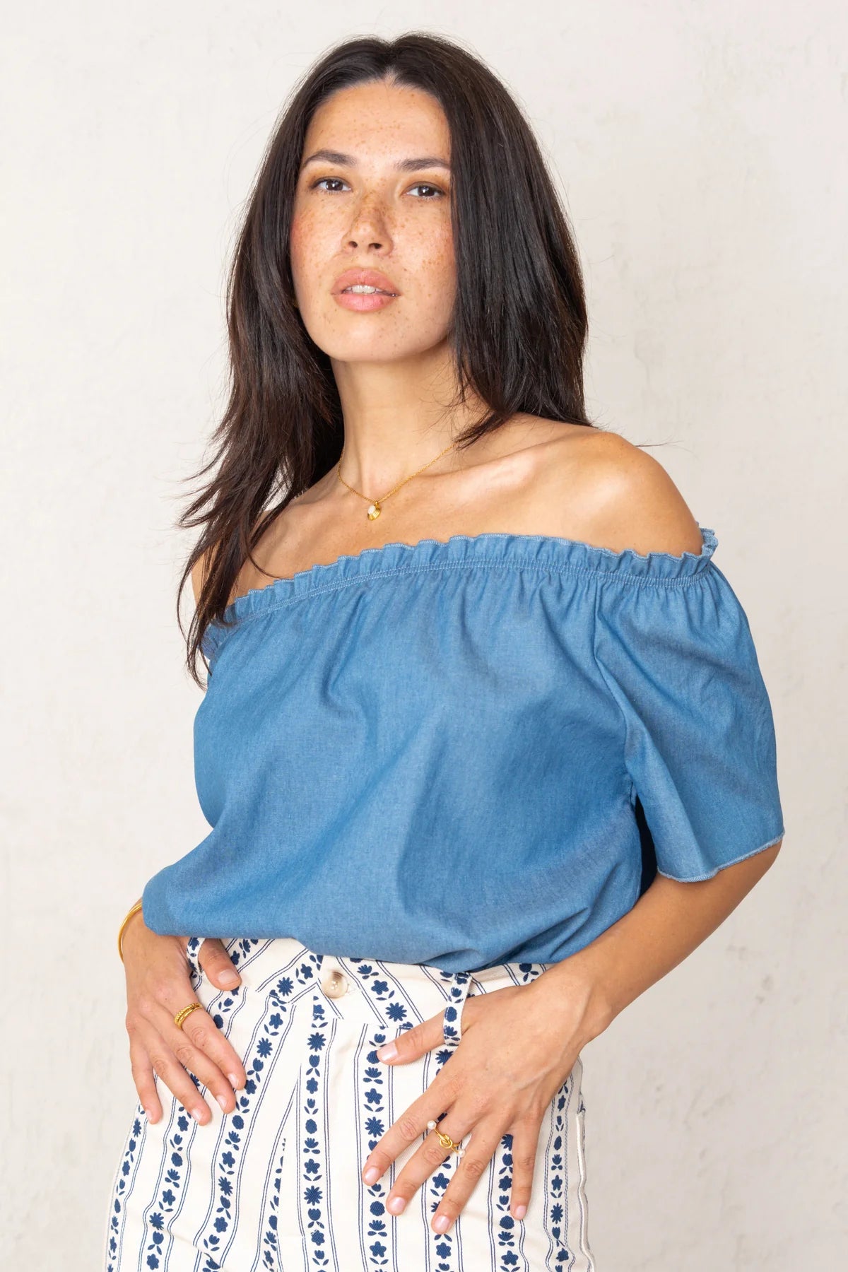Loose, flowing shirt with a boat neckline and gathered elastic that can be worn at the shoulders, and short sleeves.