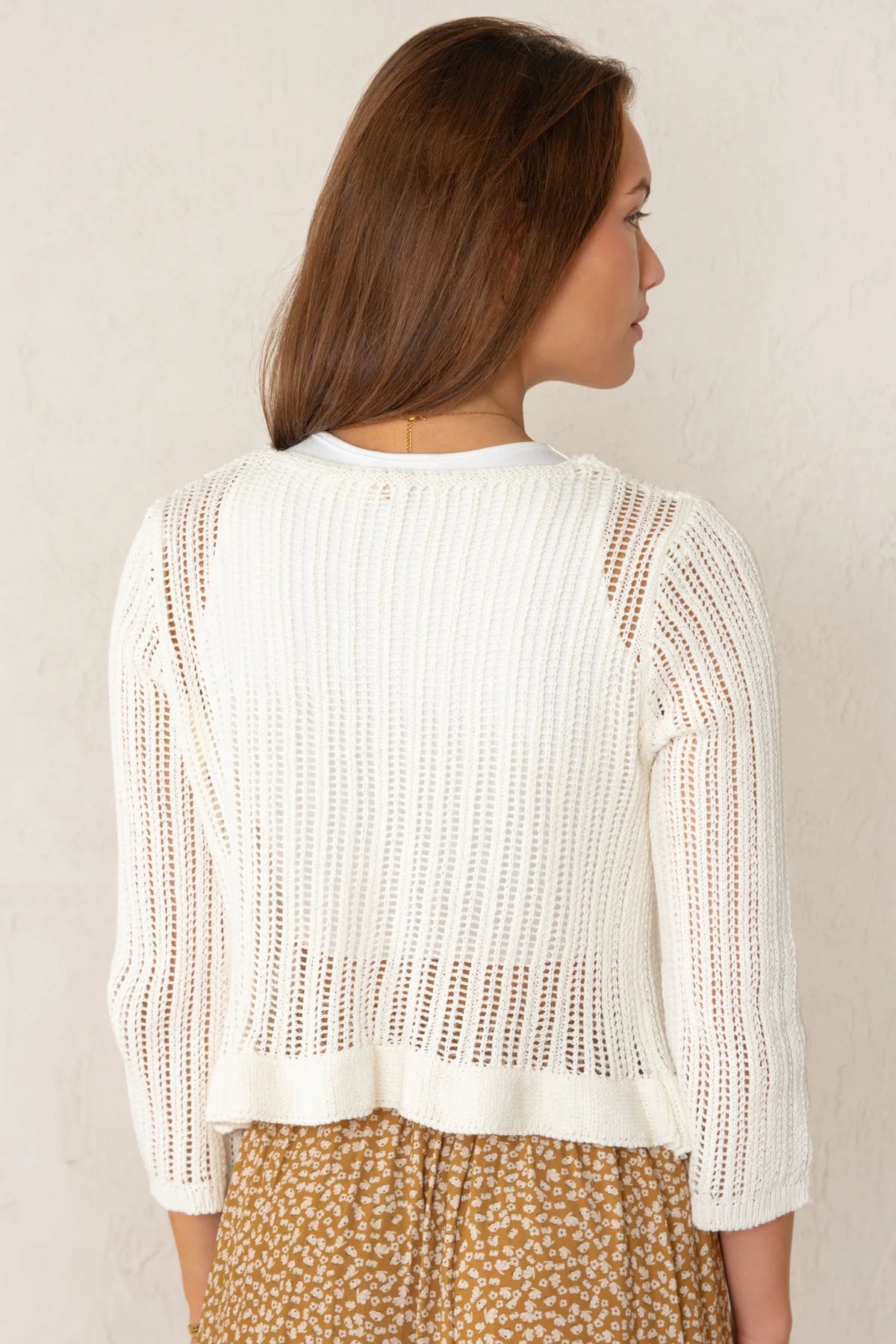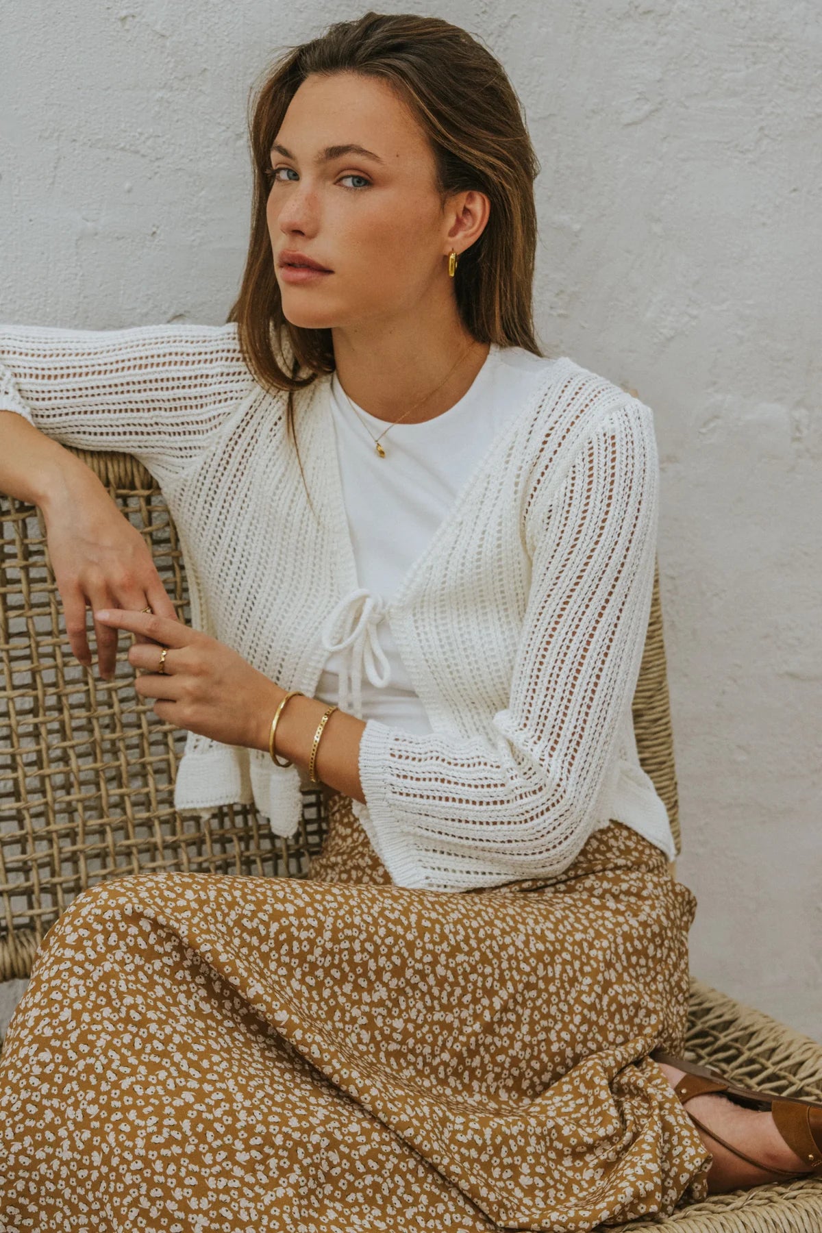 Cream ribbed knit jacket. It features long sleeves and a V-neckline with a bow detail. The hemline is finished with a ruffle.