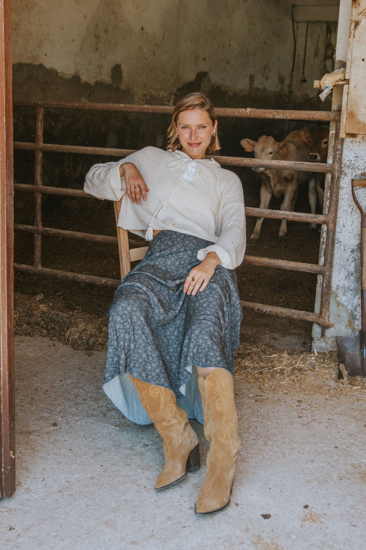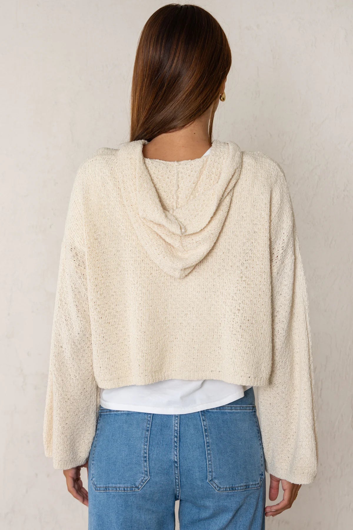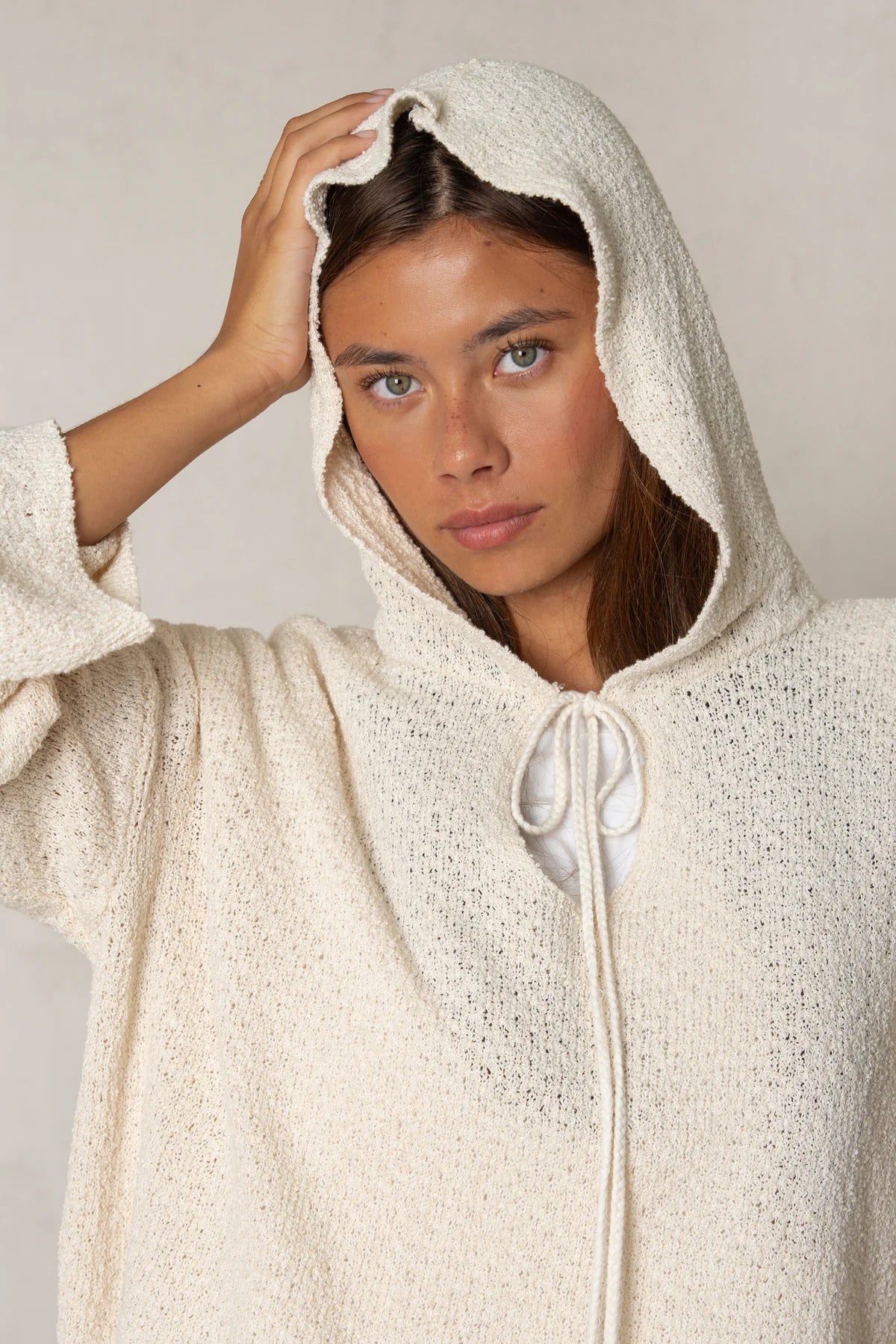 A loose, straight-cut cropped knit sweater. It features an open neckline with a bow detail and a hood. The sleeves are long. It's made of soft, pleasant-to-the-touch fabric, making it a perfect wardrobe staple.