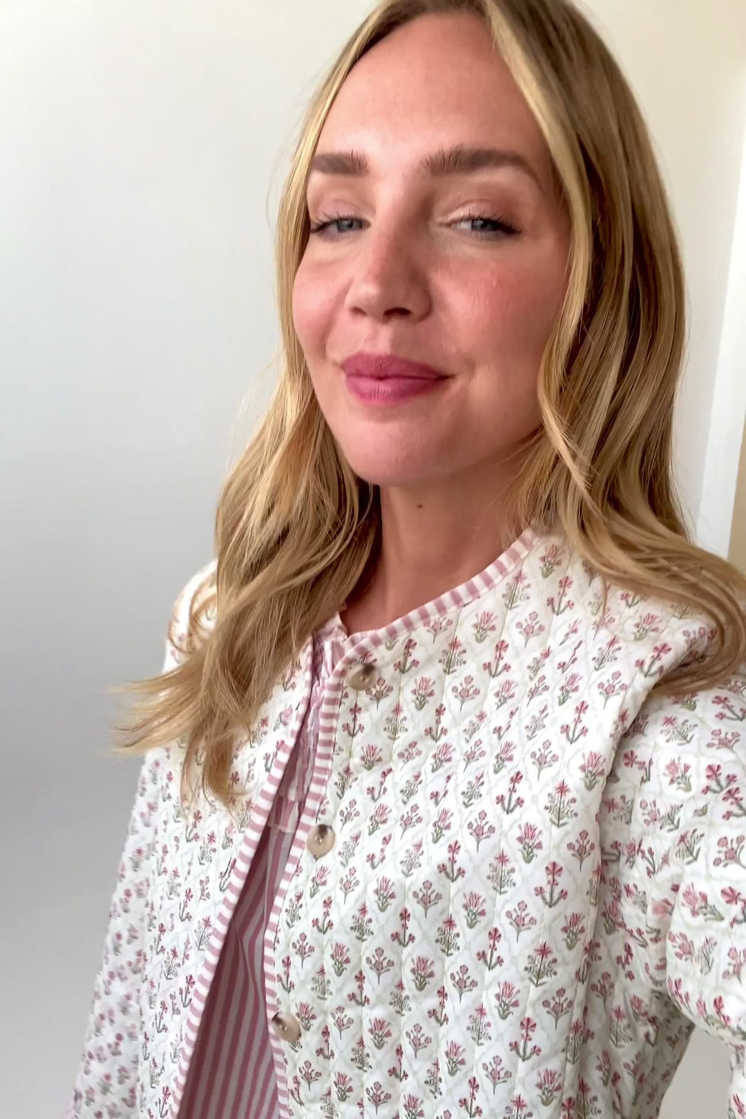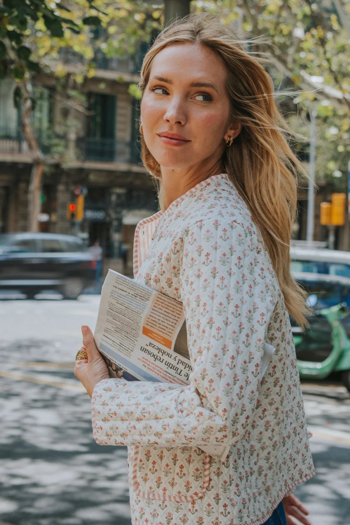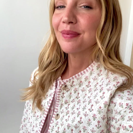 Straight-cut quilted jacket with a digital floral print in shades of pink on the outside and a pink and white striped design on the inside. It features a round neck, two front pockets, and five tortoiseshell buttons on the front. The inner lining is finished with a piping detailing the outer edges of the jacket.