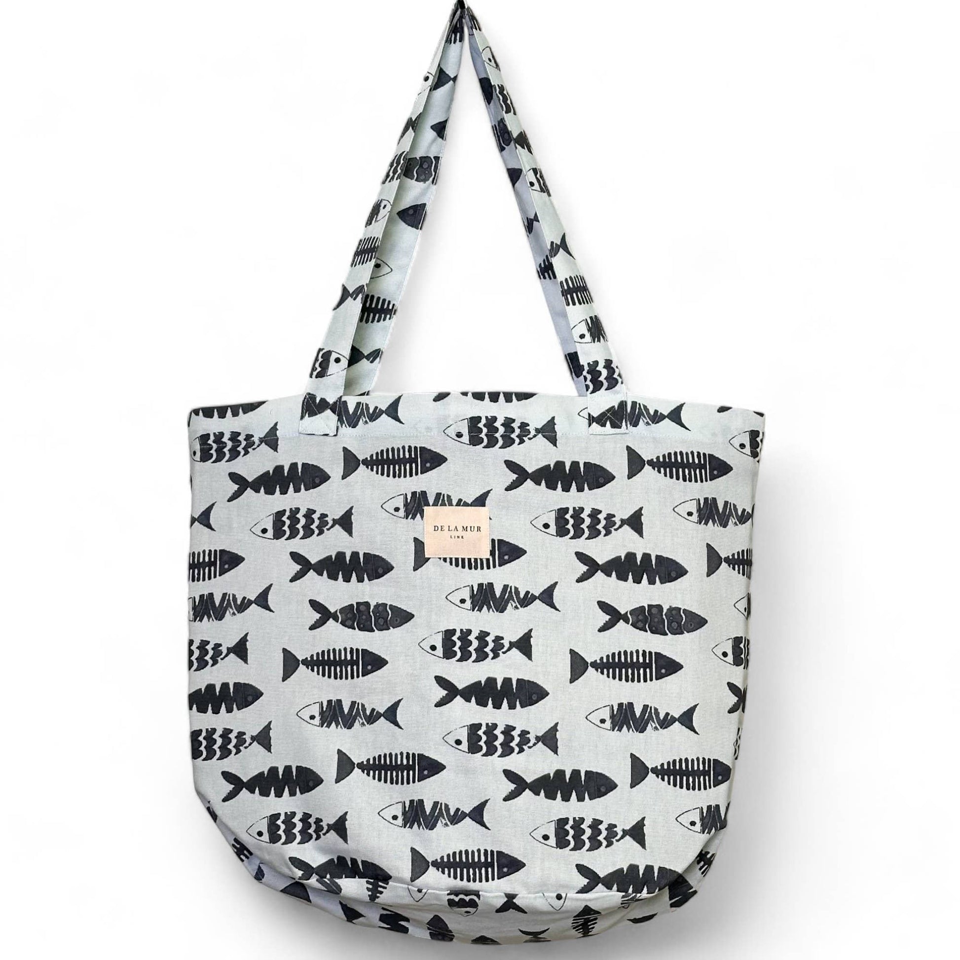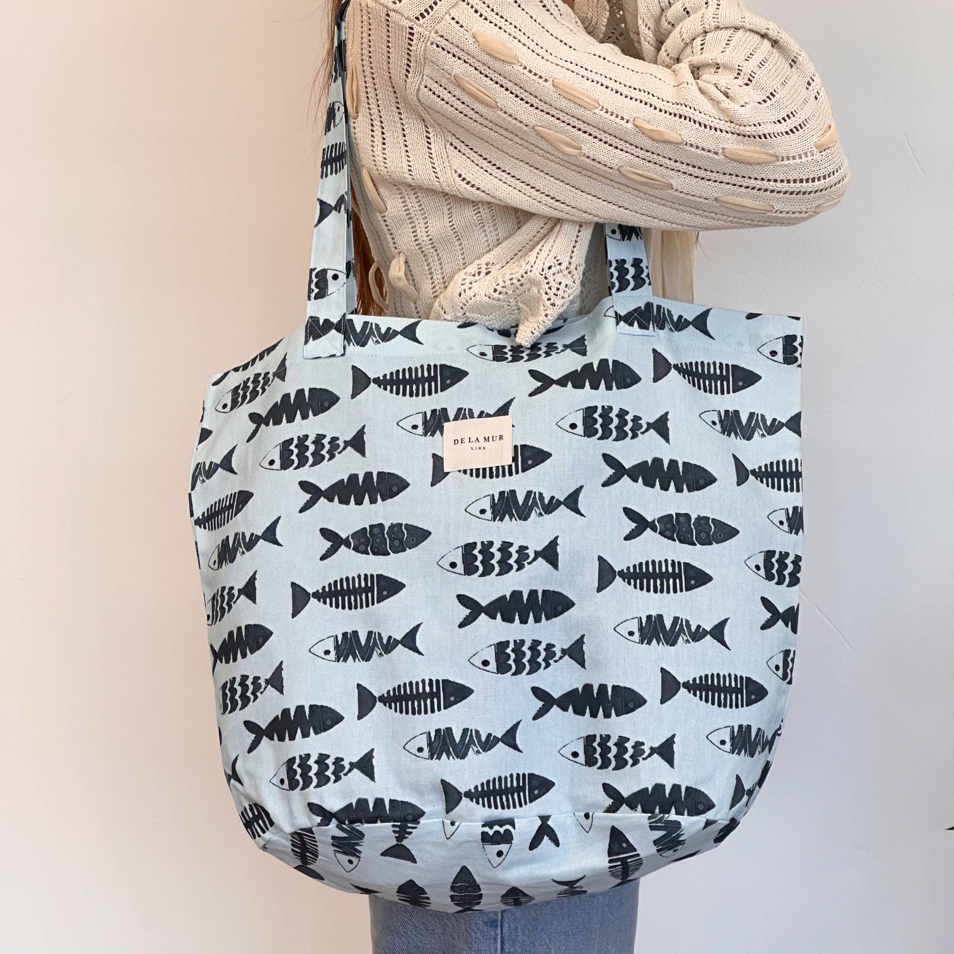 Large shopper bag with shoulder straps. Made from fabric with a fish print in blue tones on a light blue background.