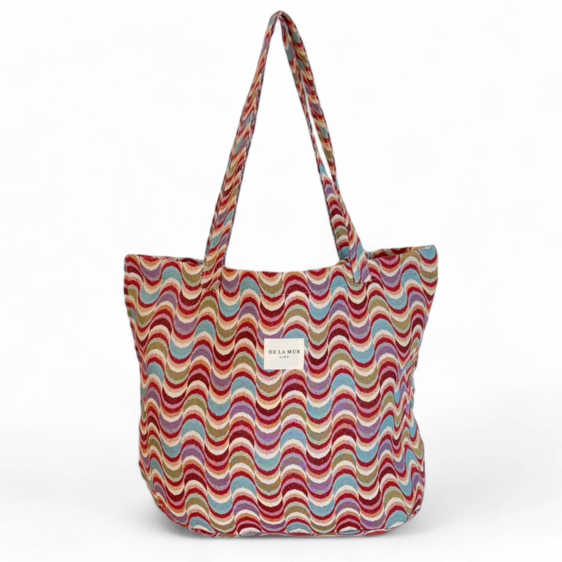 Large shopper bag with shoulder straps. Made from thick jacquard fabric with a multicolor geometric pattern.