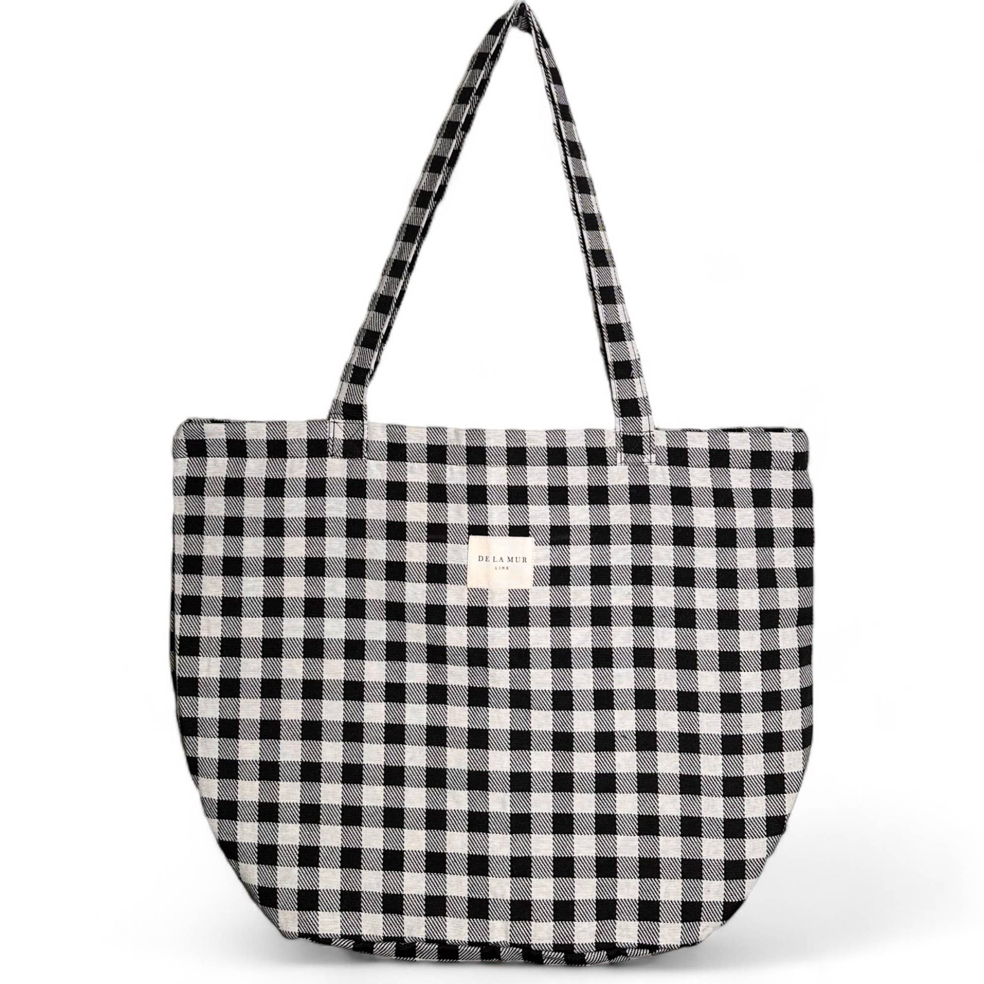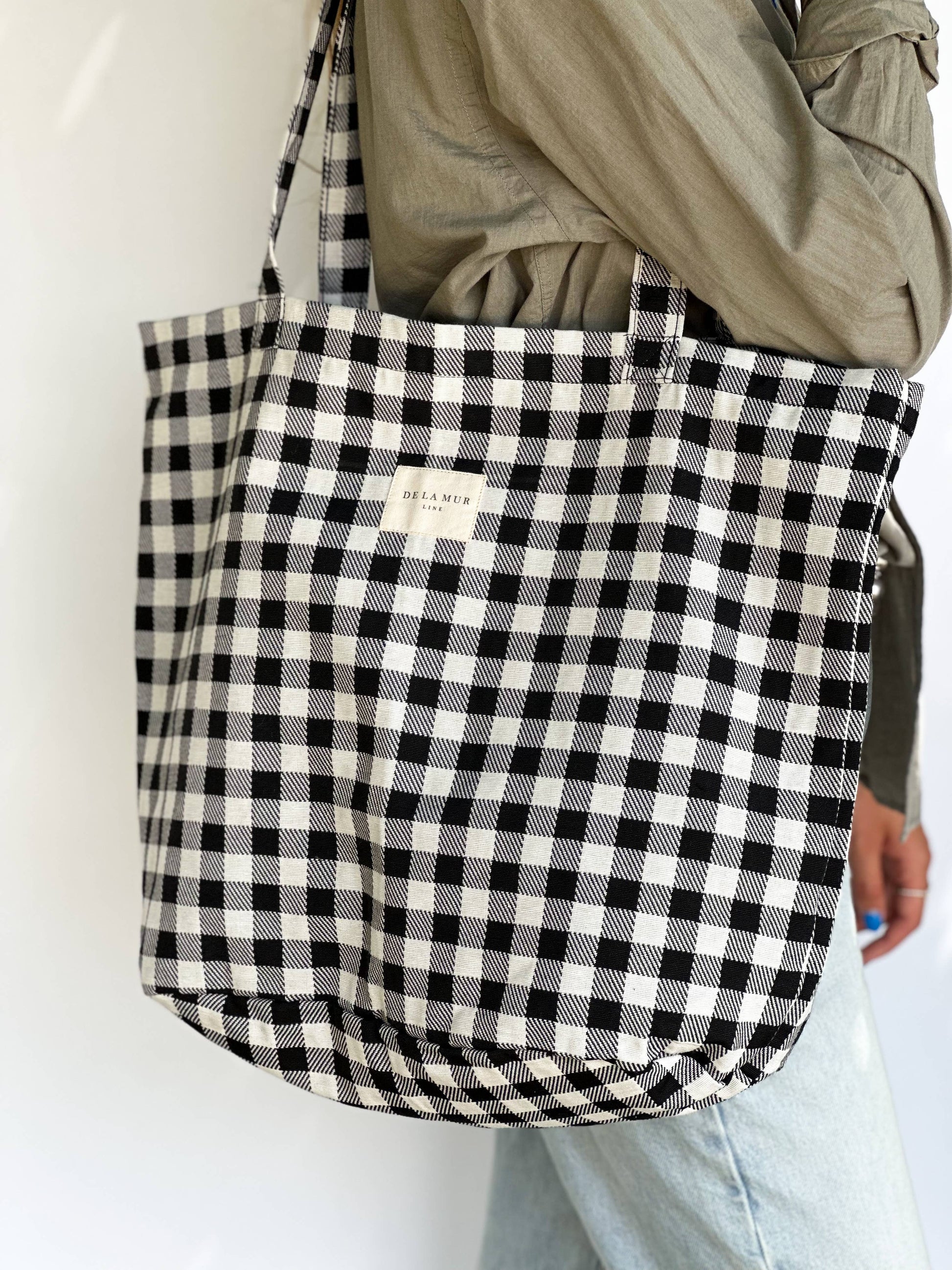 Large shopper bag with shoulder straps. Made from thick fabric with a black and white gingham check pattern.