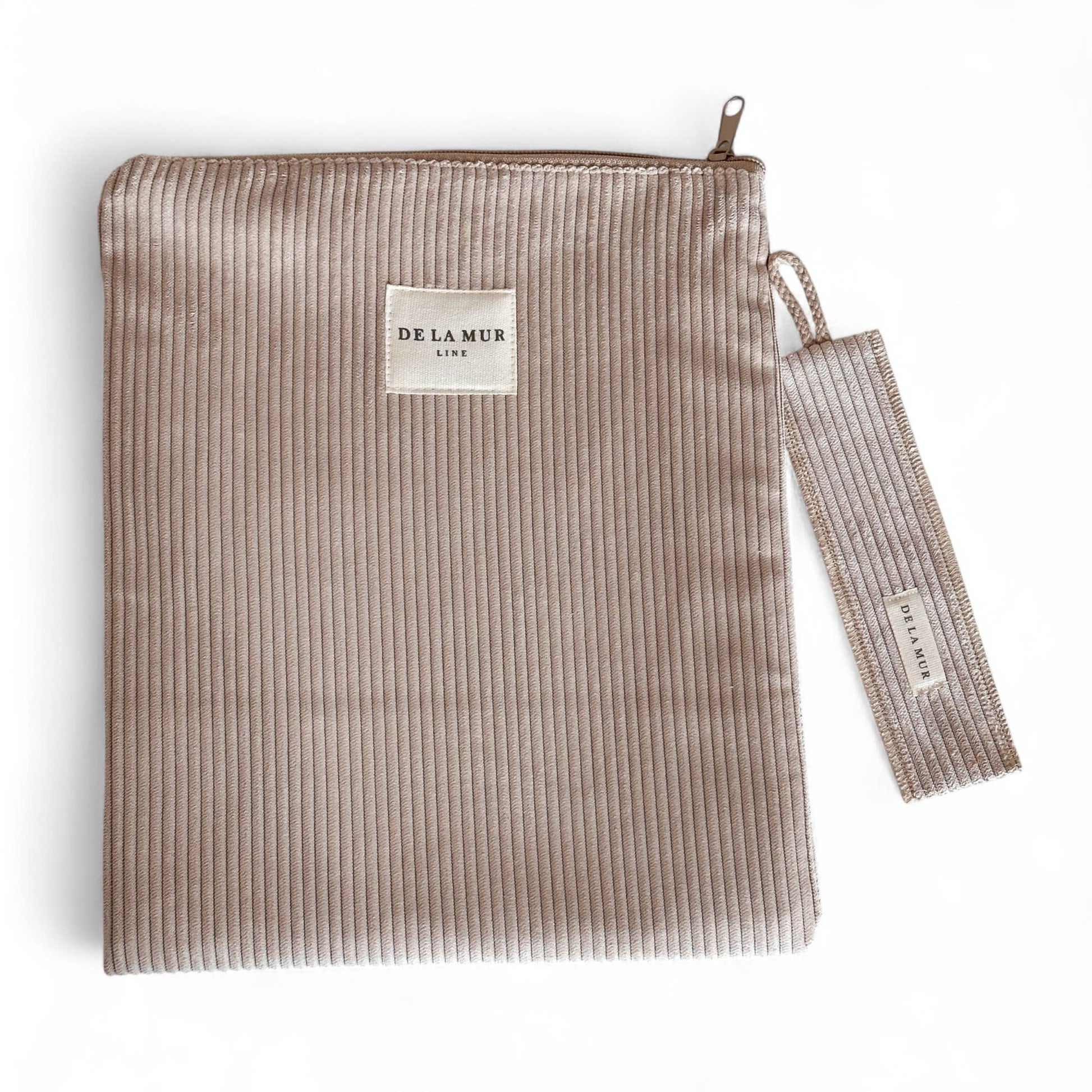 Zippered book cover with matching bookmark. Made from thick beige corduroy fabric. Fully lined with thick grey fabric on the inside.