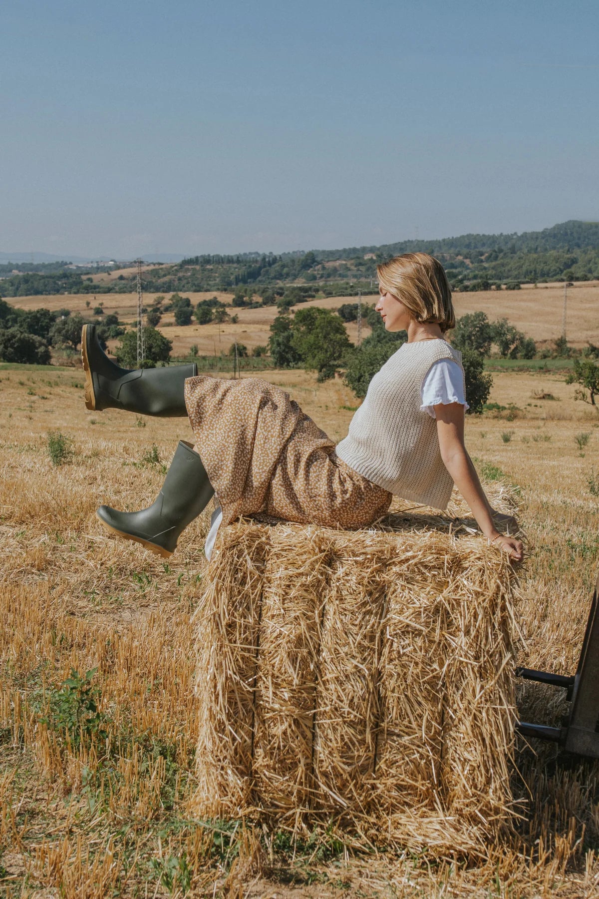 Long, flowing mustard-colored skirt with a floral print. The waistband has a wide waistband in the front and elastic in the back to adapt to your silhouette.