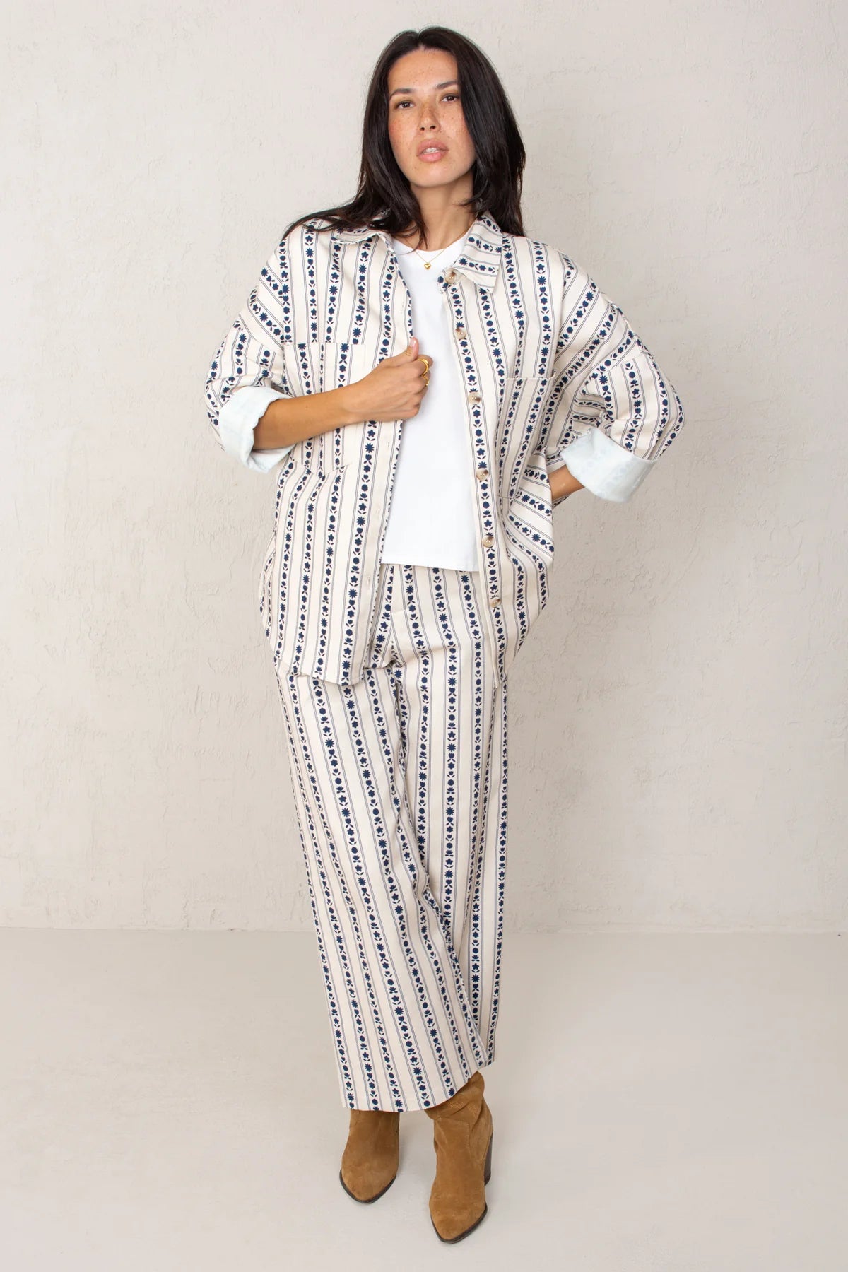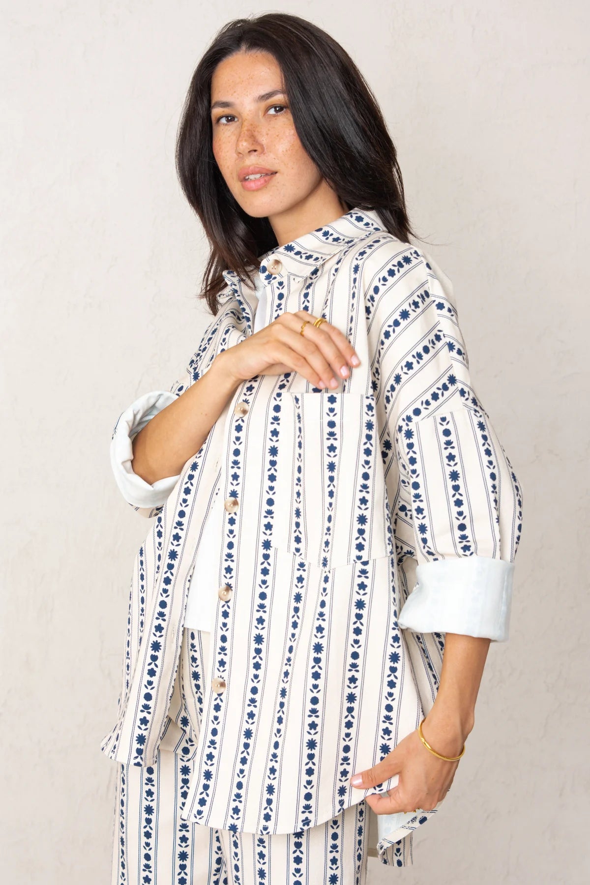 Denim jacket with a dark blue floral digital print on a white background. It's an oversized overshirt style with a wide, straight cut and dropped shoulders. It has two front chest pockets and button closure. Each cuff has a tortoiseshell button.
