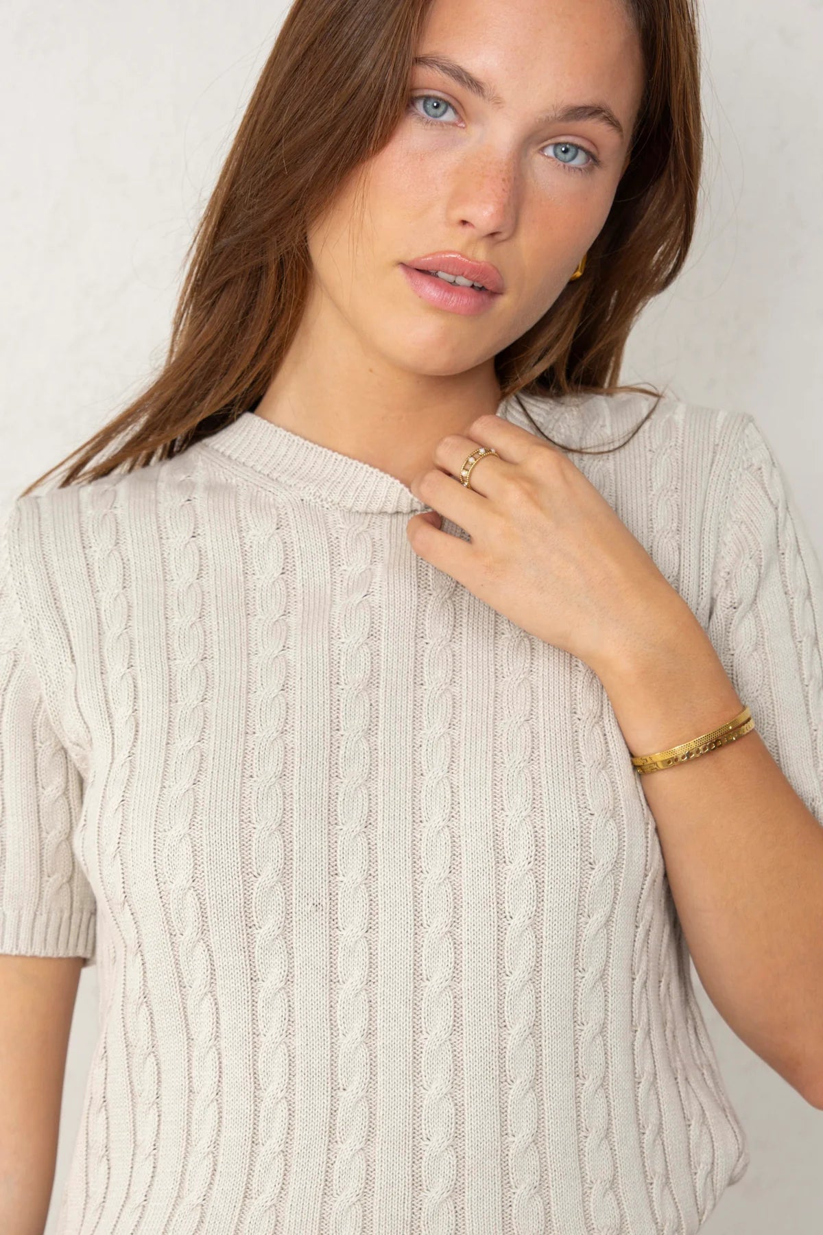 Knitted sweater with a braided design. It features a round neckline and short sleeves with a ribbed hem and trim.