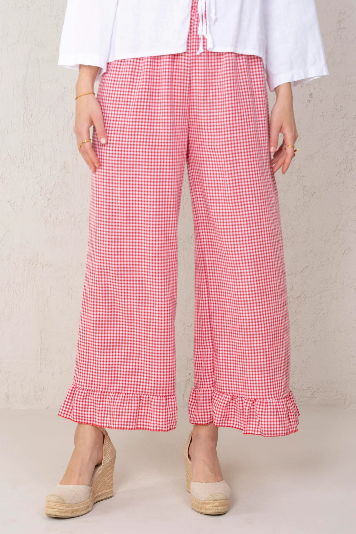 Red gingham pants. They have a wide, straight cut with an elastic waistband for a snug fit. and small ruffles at the bottom.