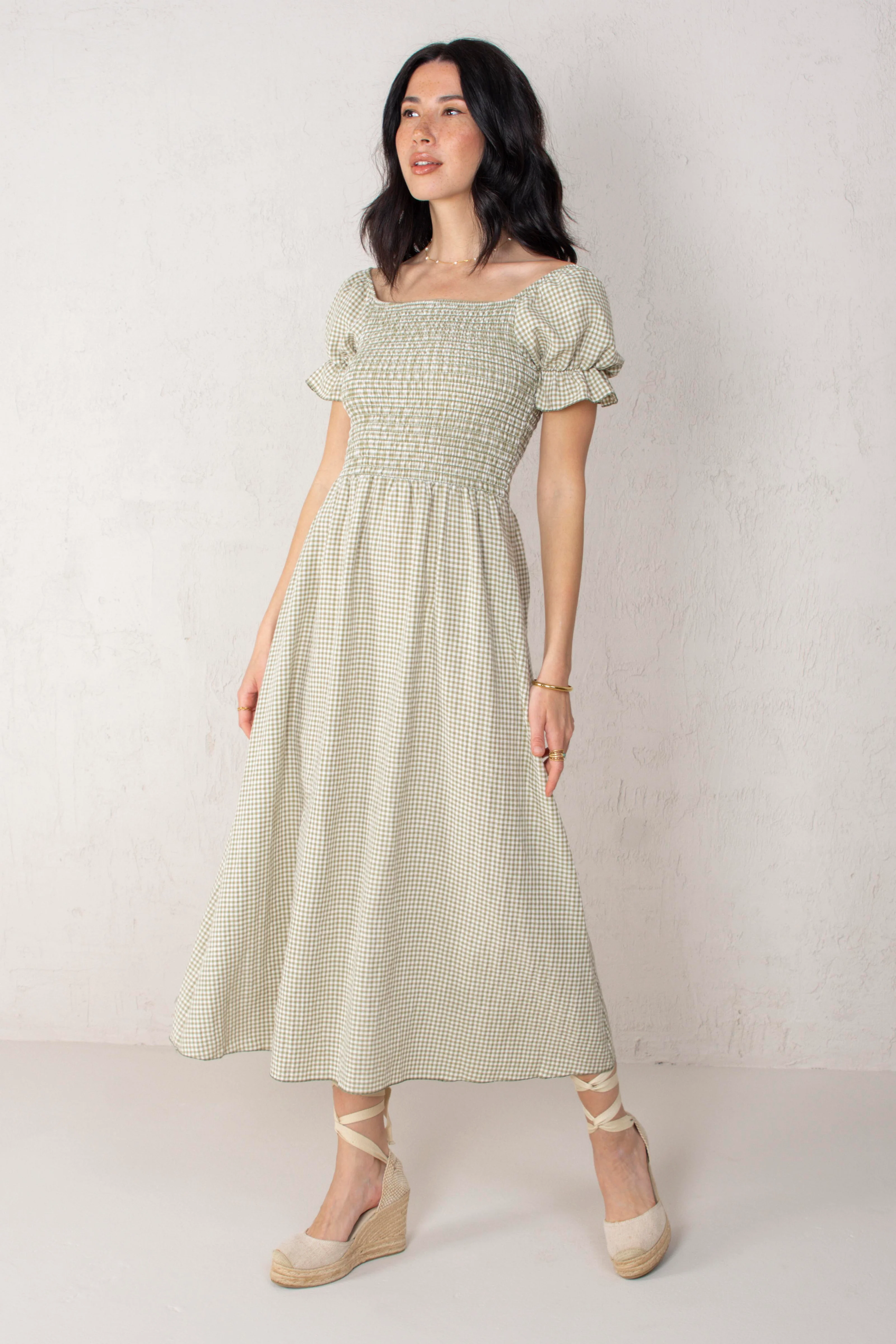 Long gingham dress. The bodice is made of stretch honeycomb and has short puff sleeves with ruffled edges. The skirt is flowing and A-line.