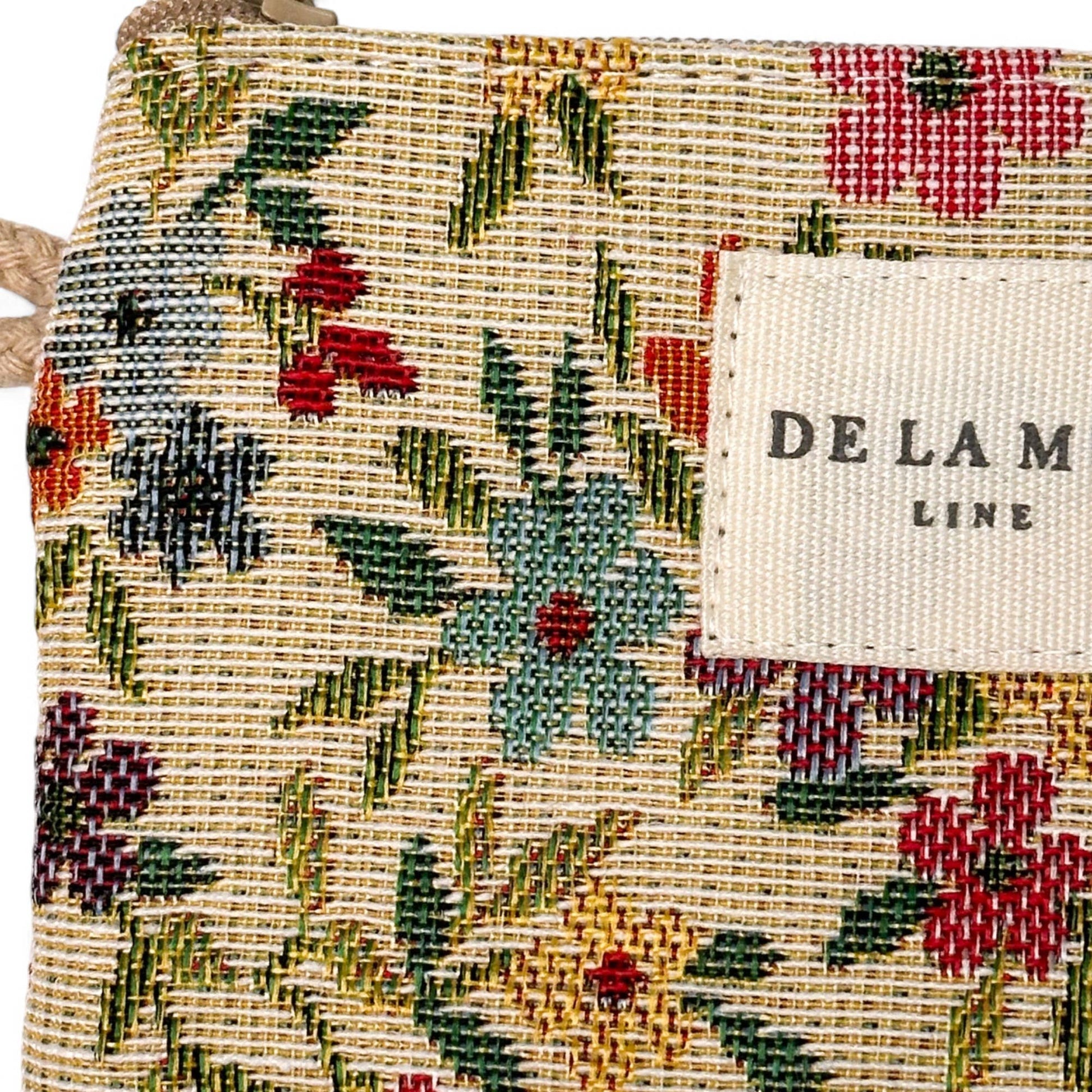 Coin purse with a zipper at the top and a small beige cord handle on the side. Made with thick jacquard fabric with a floral pattern on a beige background. Each item may vary in pattern depending on where the fabric was cut. Lined with thick grey fabric on the inside.