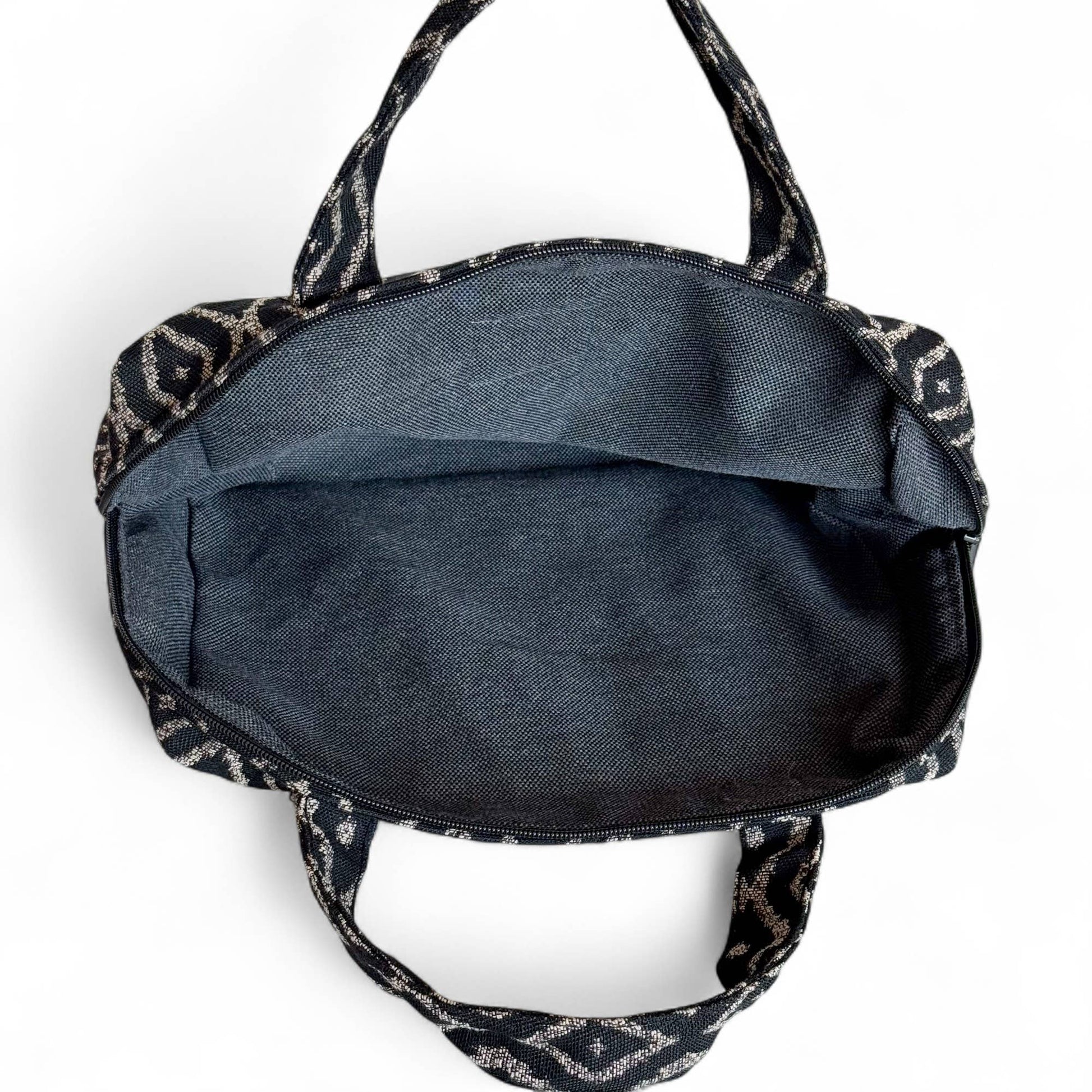 Extra-large pouch with a top zipper and fabric handles. Made from thick jacquard fabric with a beige and black geometric pattern. Lined on the inside with thick gray fabric.