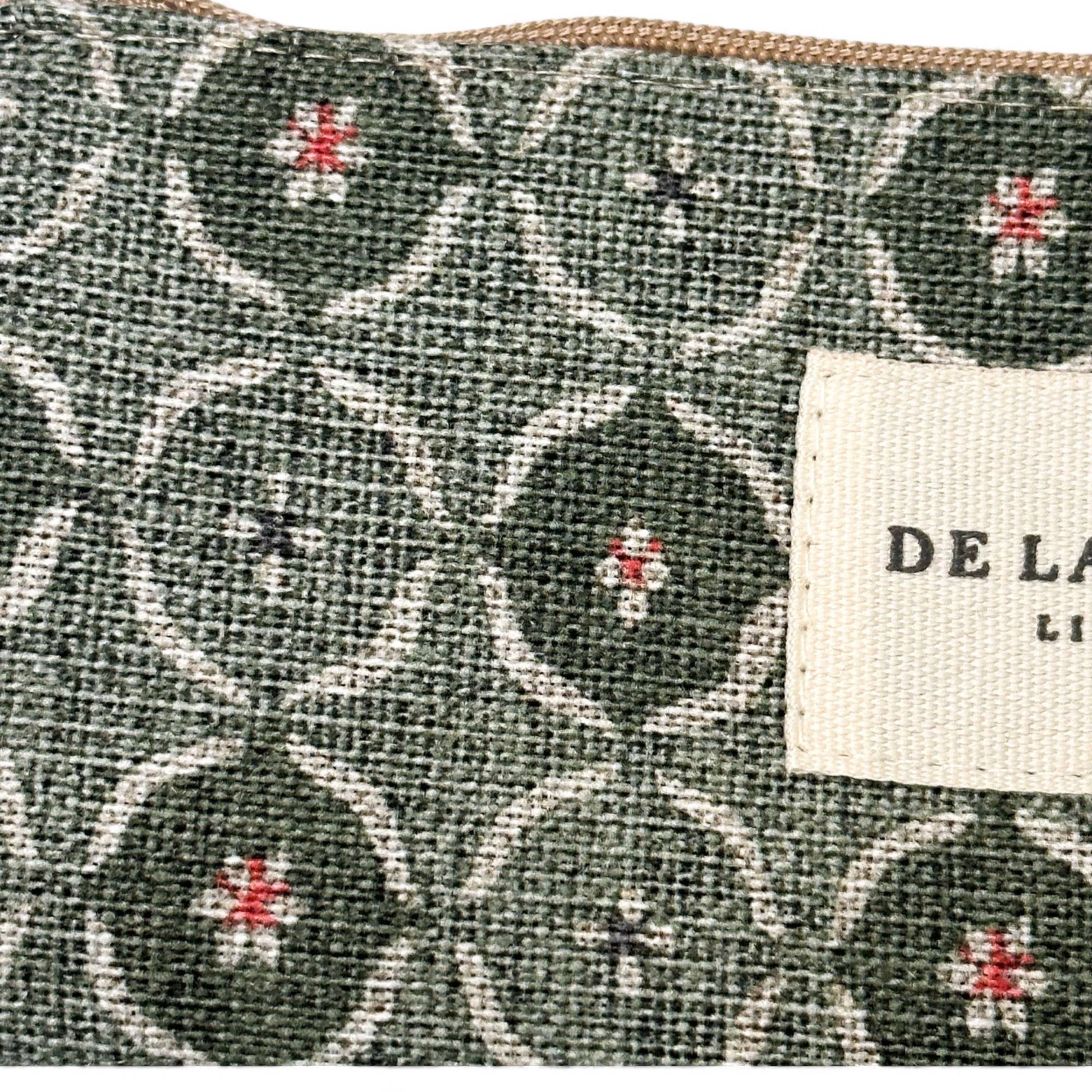 Eyewear case with a zipper at the top and a small beige cord handle on the side. Made with fine half-panama fabric with a geometric print in green tones. Each item may vary in the print depending on where the piece was cut. Lined with thick grey fabric on the inside.