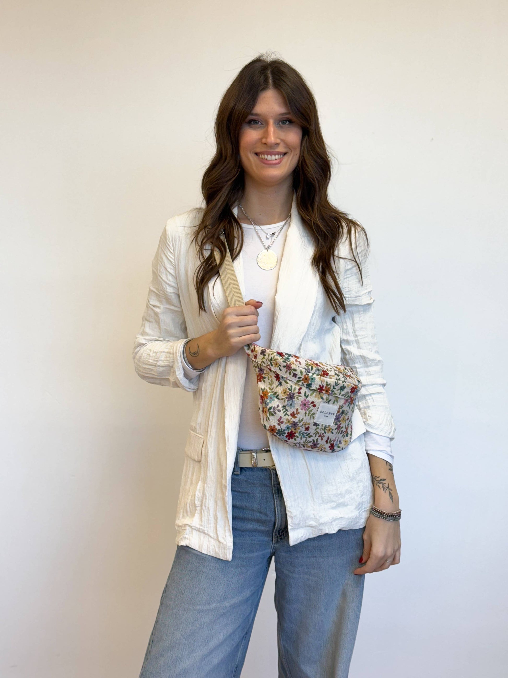 Fanny Pack with an adjustable long strap made of beige cotton webbing. Made from a thick jacquard fabric with a floral print on a beige background. Zipper closure at the top. Lined with a thick gray fabric inside.