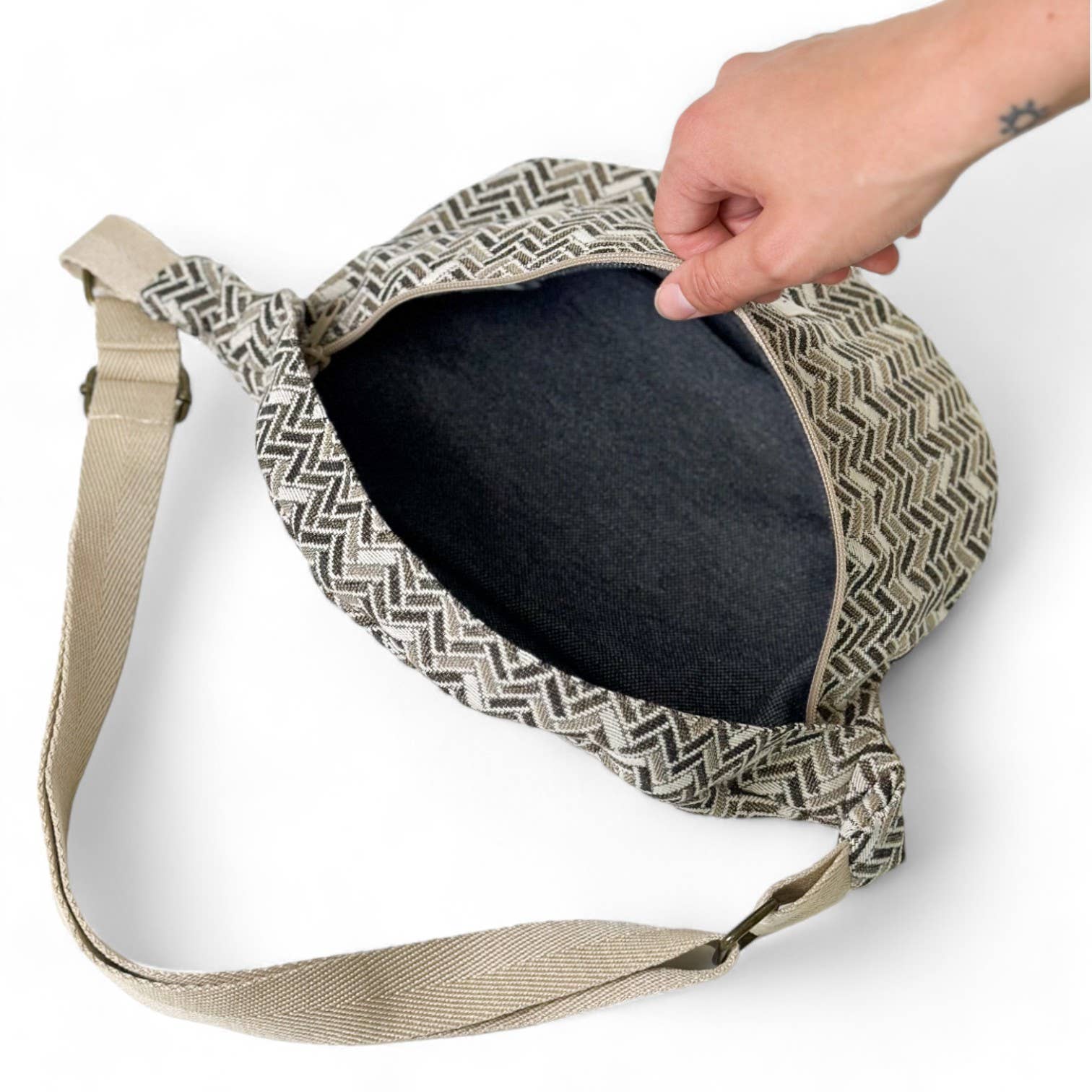 Crossbody fanny pack with a long adjustable strap made of beige cotton herringbone ribbon. Made from thick jacquard fabric with a geometric print in brown tones. Top zipper closure. Lined with thick gray fabric on the inside.