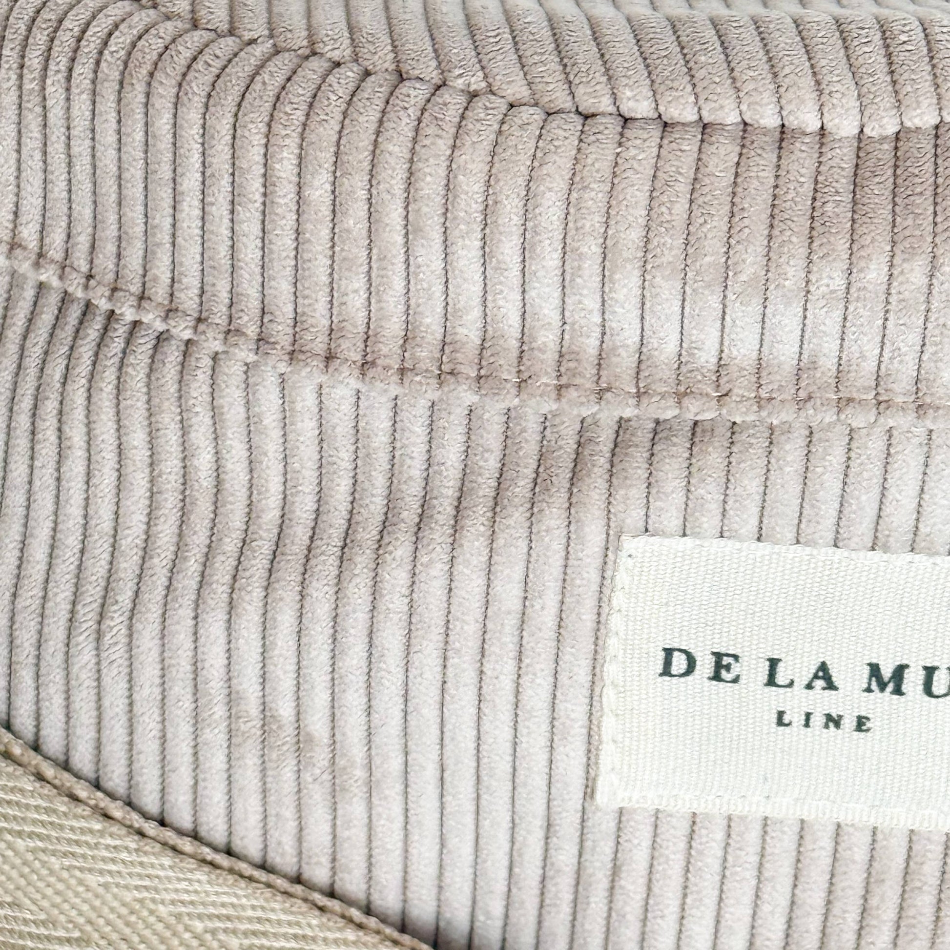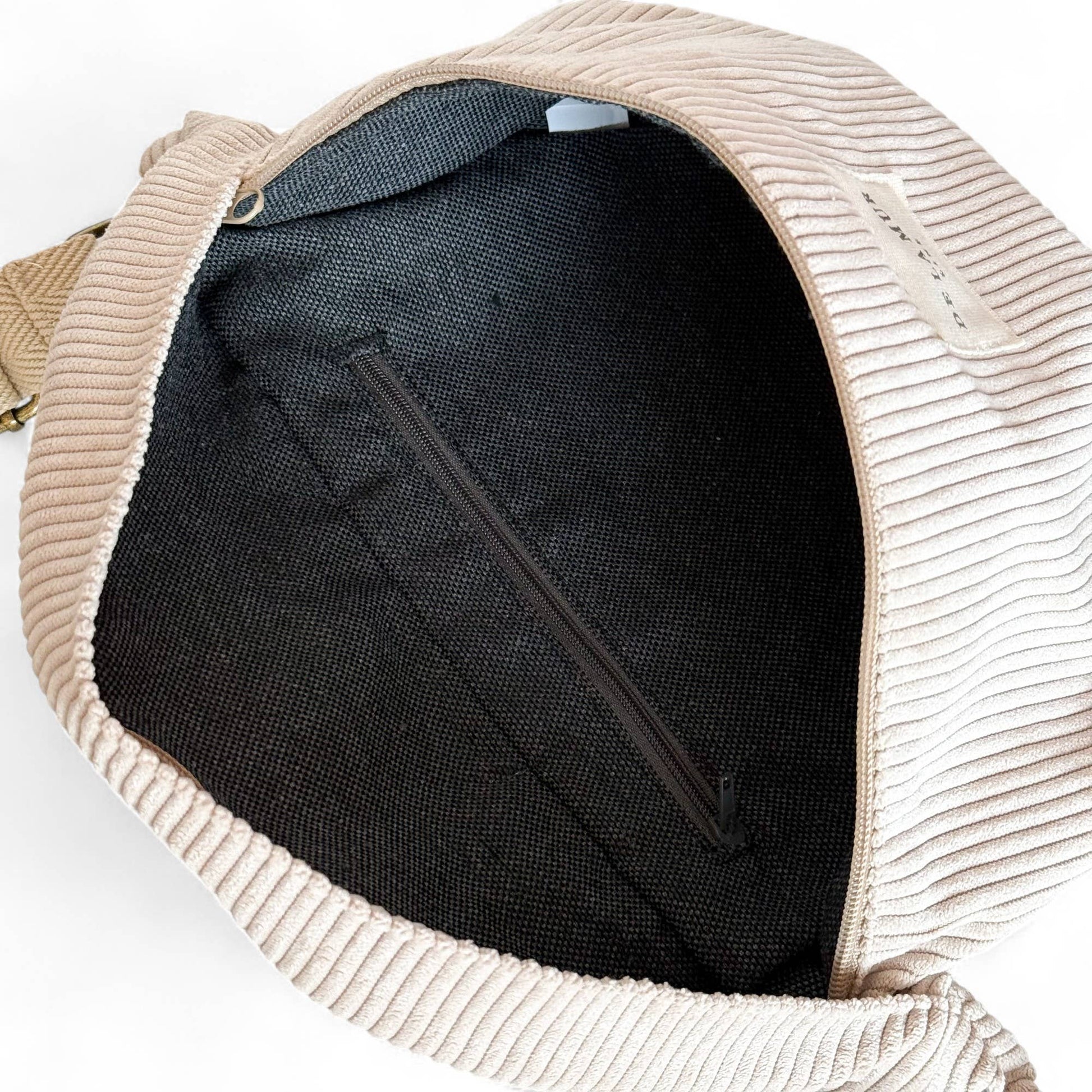 Fanny pack-style crossbody bag with an adjustable long strap made of beige herringbone cotton tape. Made with thick beige corduroy fabric. Top zipper closure. Inner pocket. Lined with thick gray fabric on the inside.