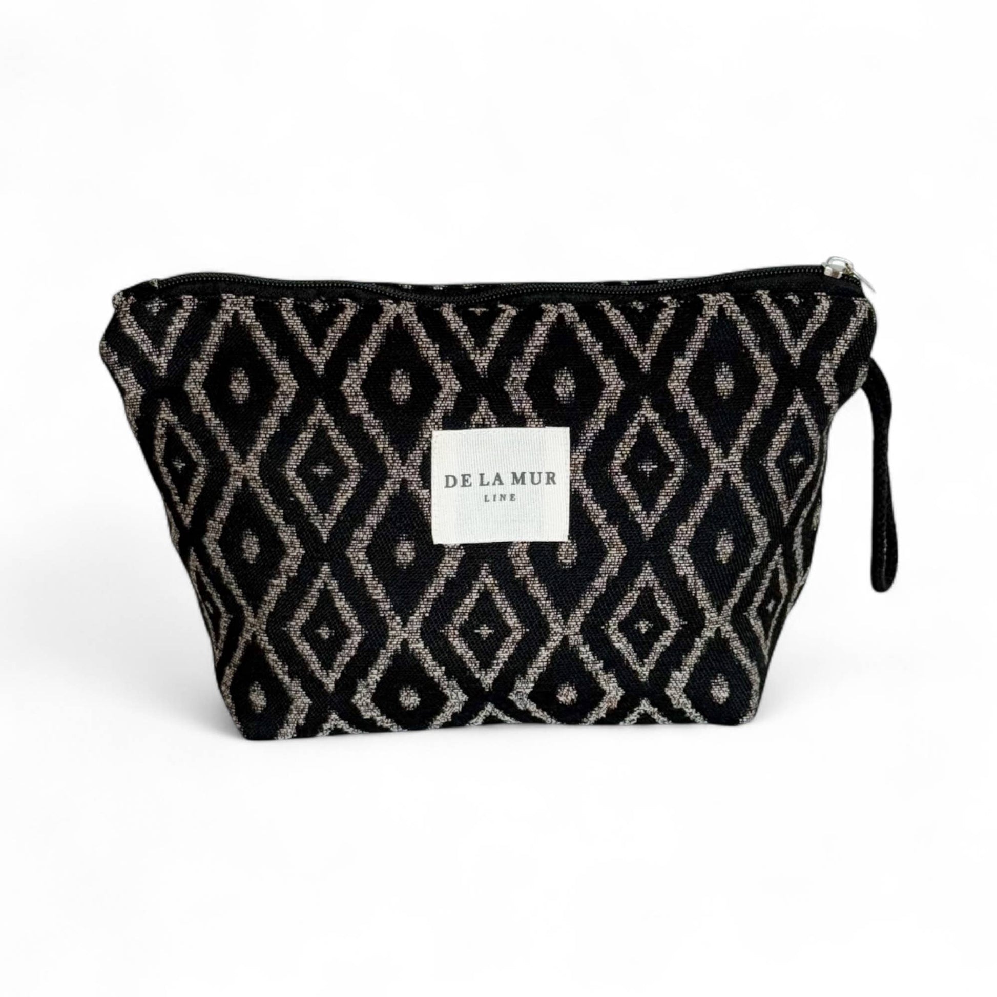 Large pouch with a zipper on top and a beige cord handle on the side. Made from thick jacquard fabric with a beige geometric pattern on a black background.