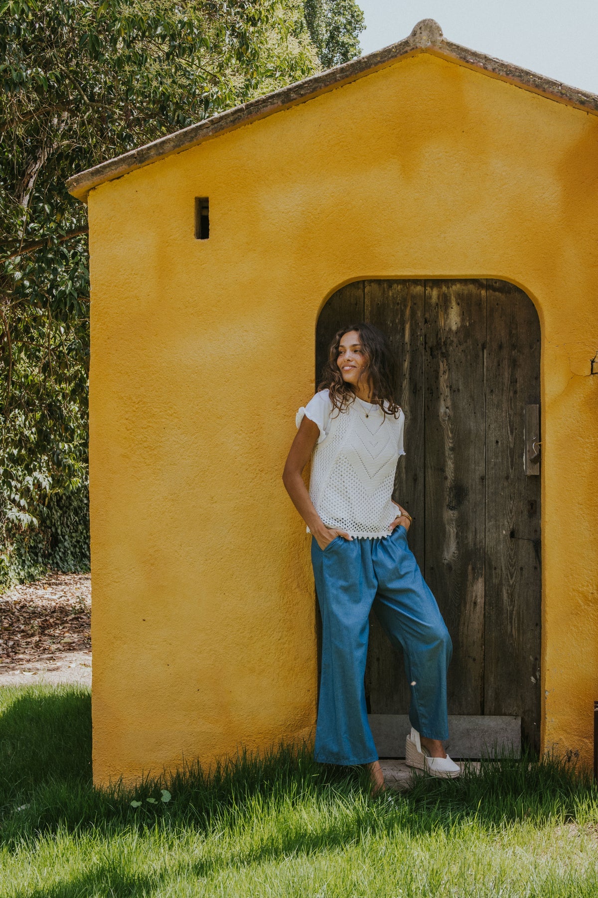 Lightweight denim pants. They have a wide, straight cut. They have an elastic waistband for a snug fit.