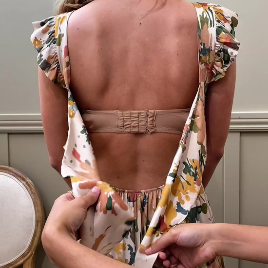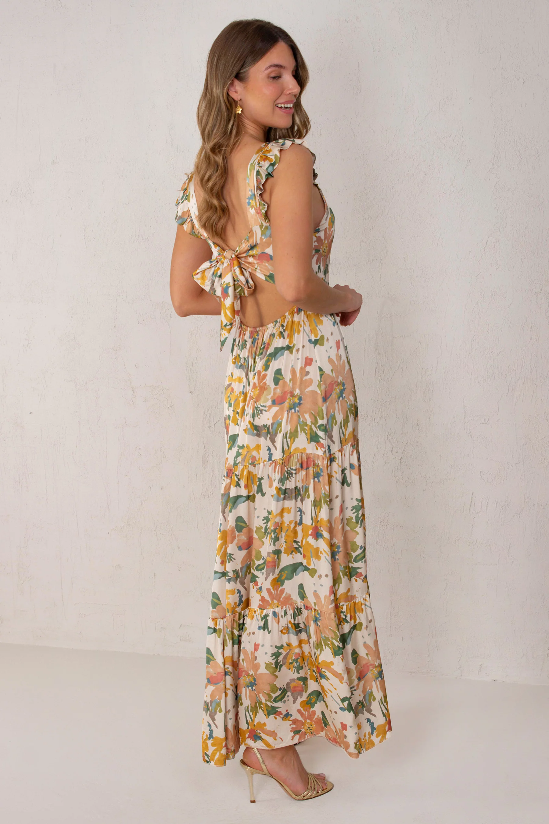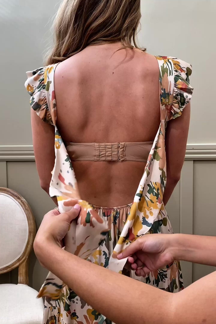 Long satin dress with a digital floral print. The straps have small ruffles. The back is open with an adjustable bow. The waist is elastic for a snug fit.