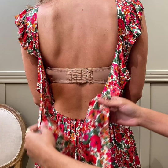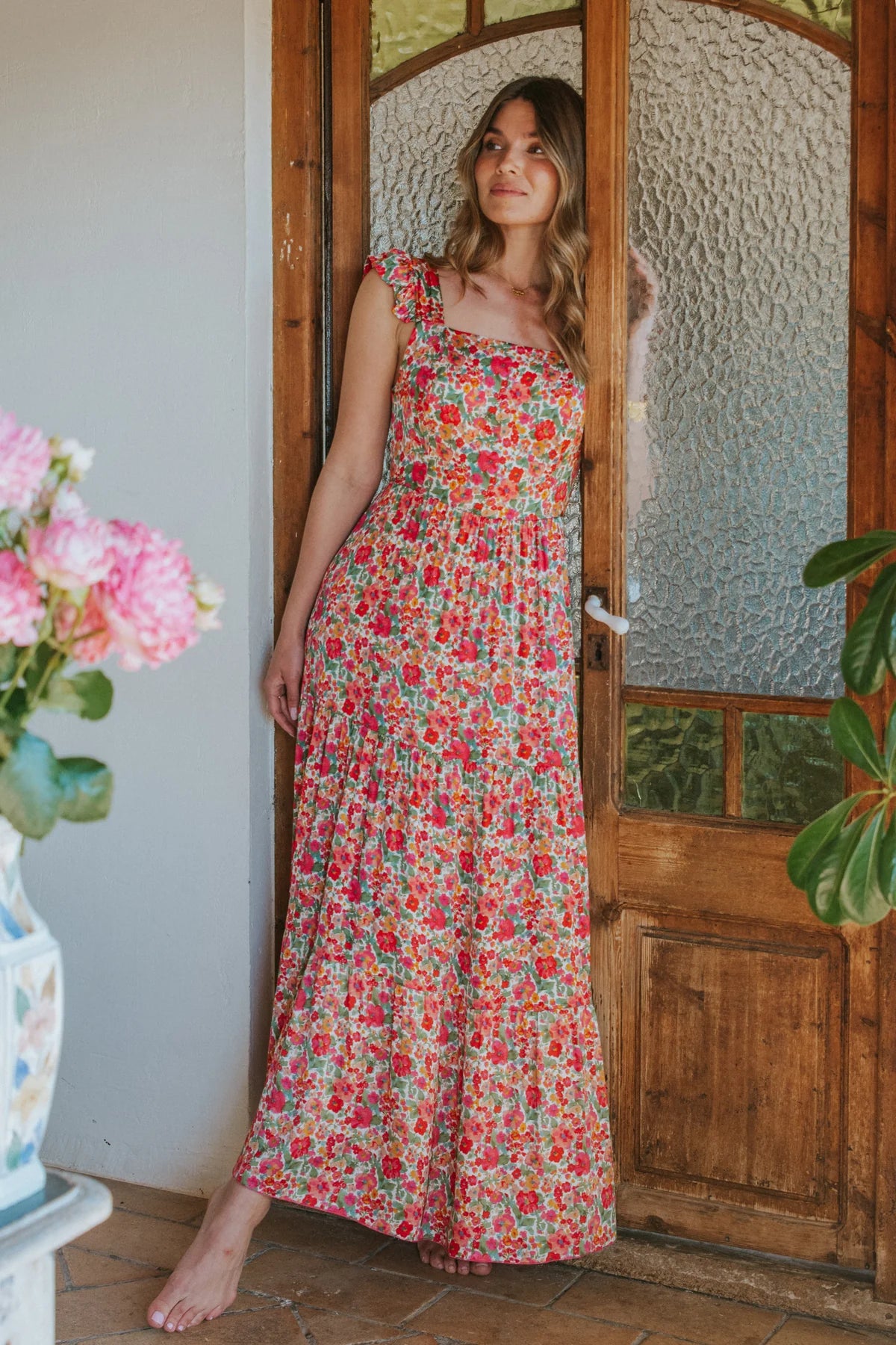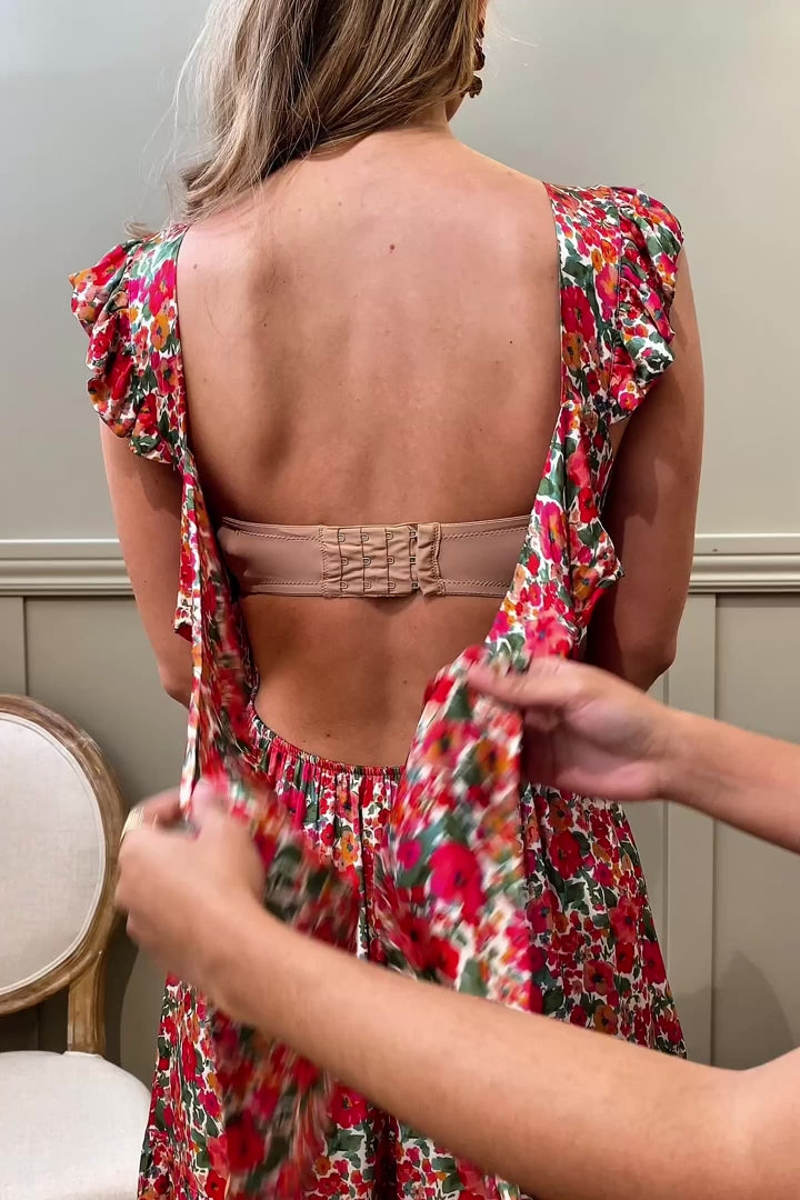 Long satin dress with a fuchsia floral digital print. The straps have small ruffles. The back is open with an adjustable bow. The waist is elastic for a snug fit.