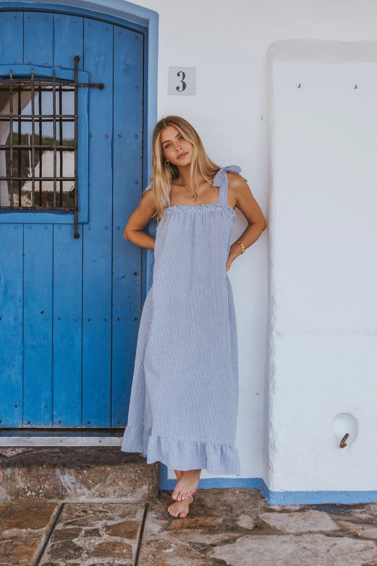 Long, flowing, loose-fitting blue dress with white stripes. It features an elastic neckline and tie straps. The hem features ruffle detailing.