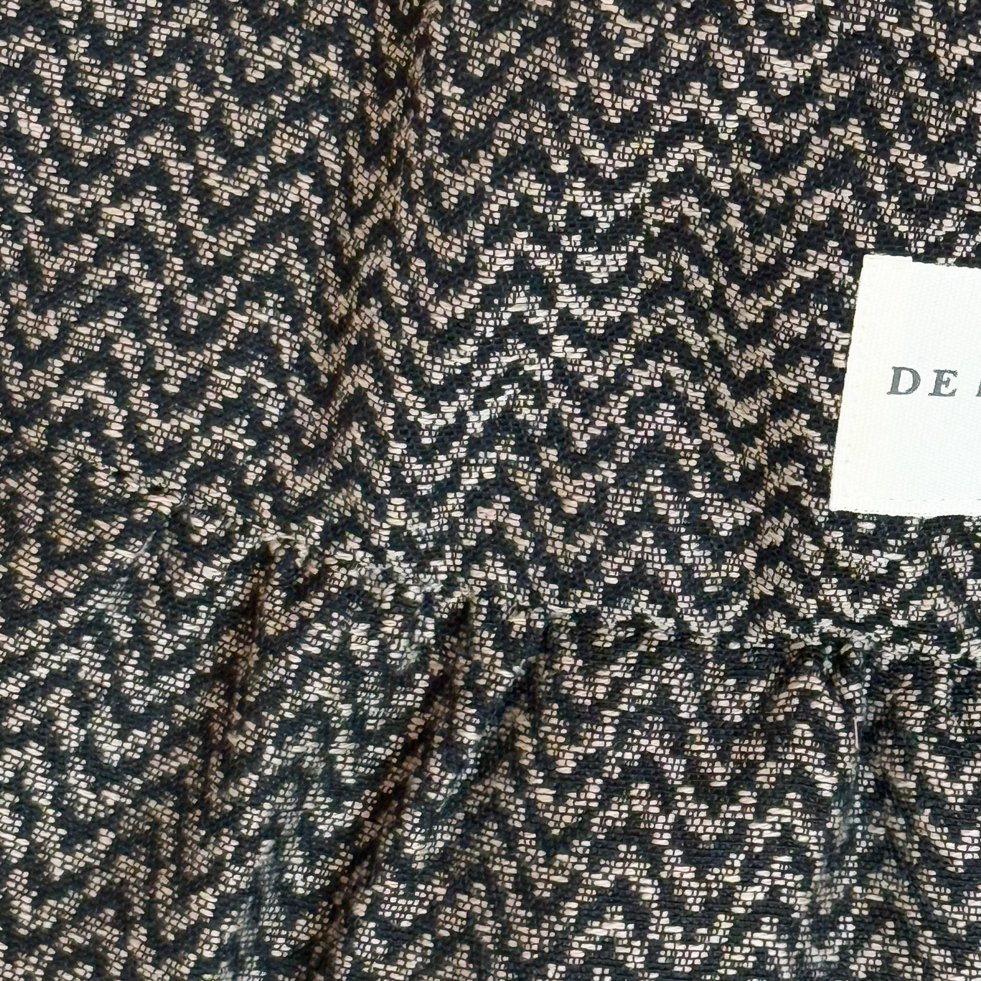 Medium ruffle bag. Made from thick jacquard fabric with a zigzag pattern in beige and black tones.
