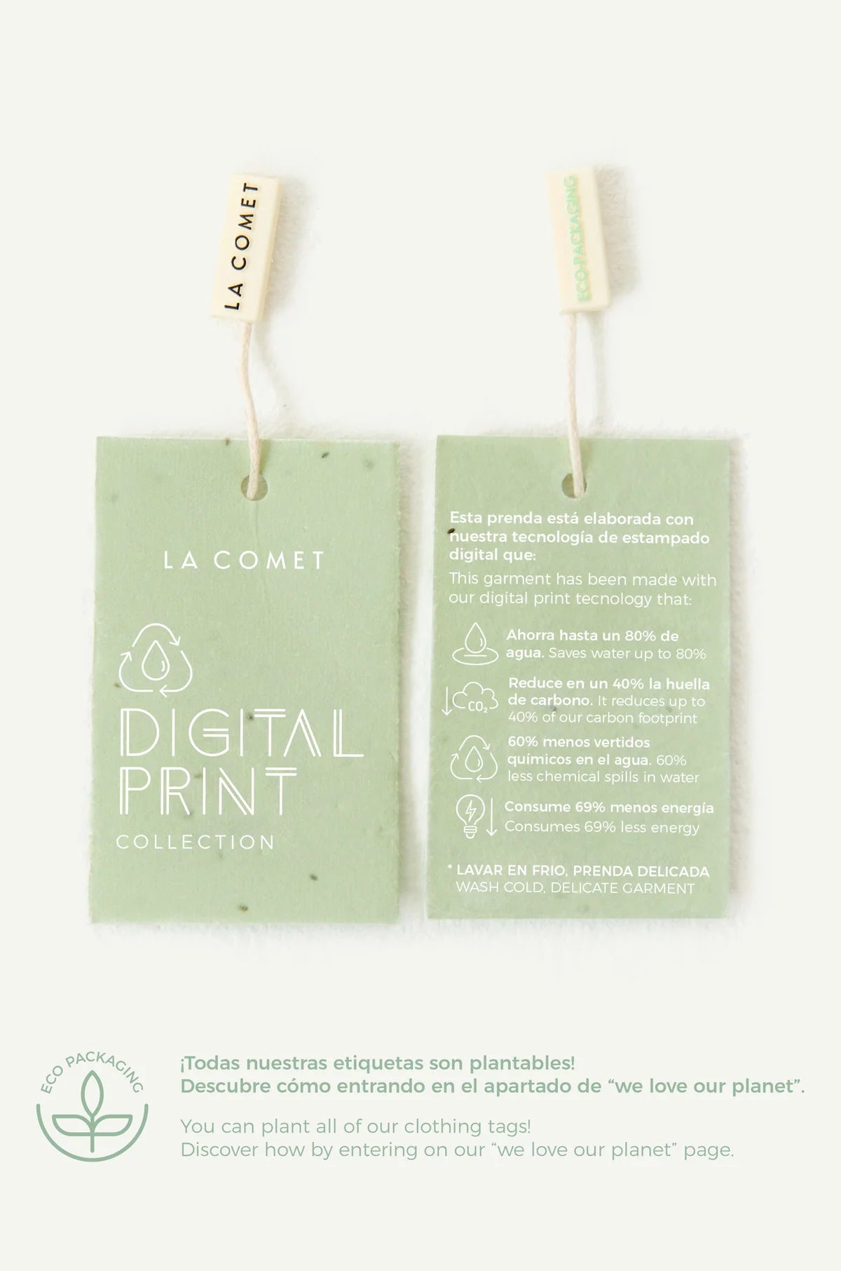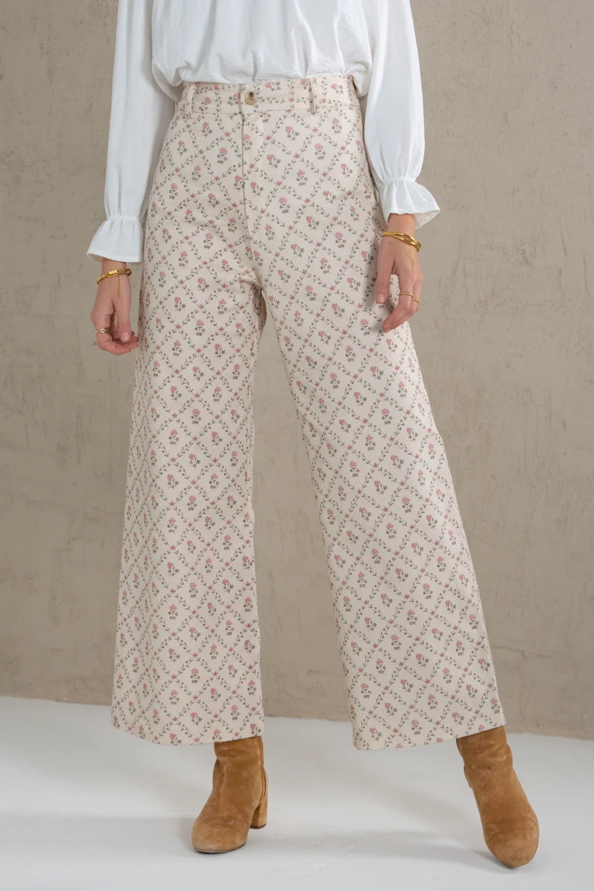 Pink floral digital print pants. High-waisted and straight-cut. Front closure with button and zipper closure. The waistband has belt loops, and the back has two pockets.