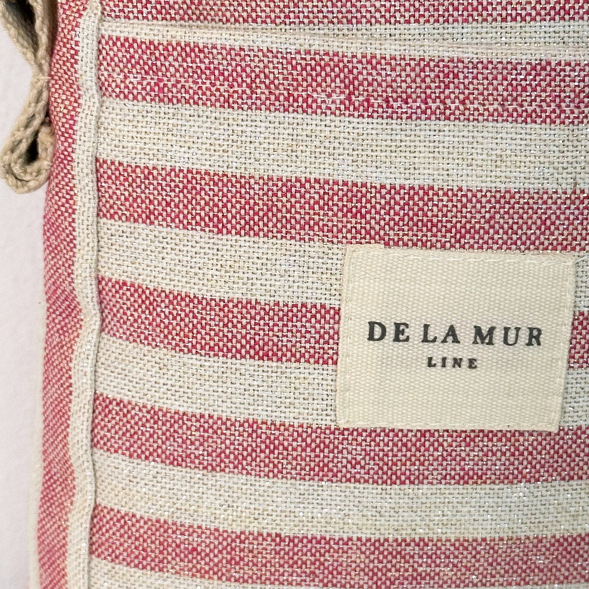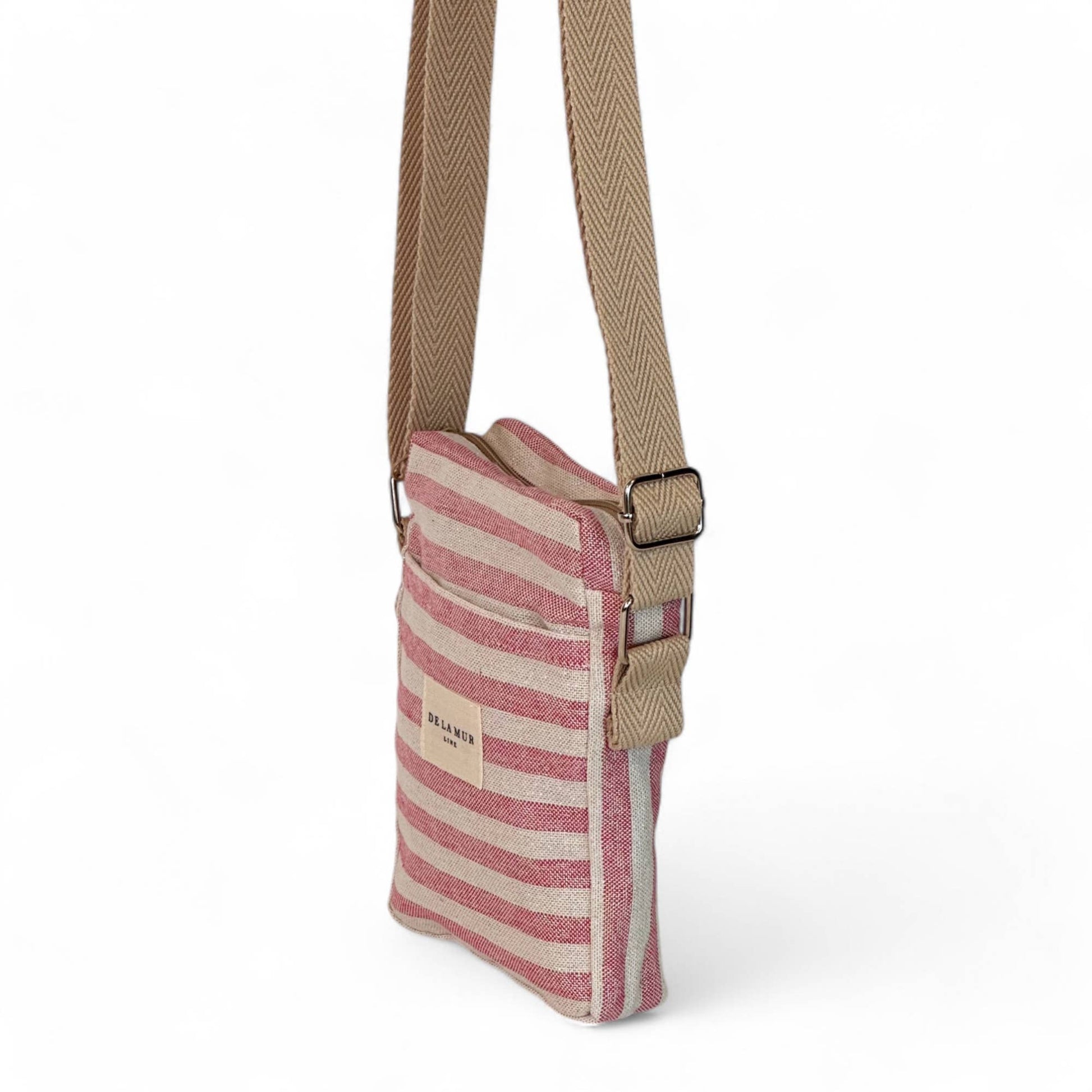 Crossbody mobile phone bag with a top zipper and an adjustable beige herringbone cotton strap. No zipper pocket on the exterior. Made from fine half-panama fabric with a pink and off-white striped pattern, featuring shiny gold and silver lurex threads. Lined with thick gray fabric on the inside.