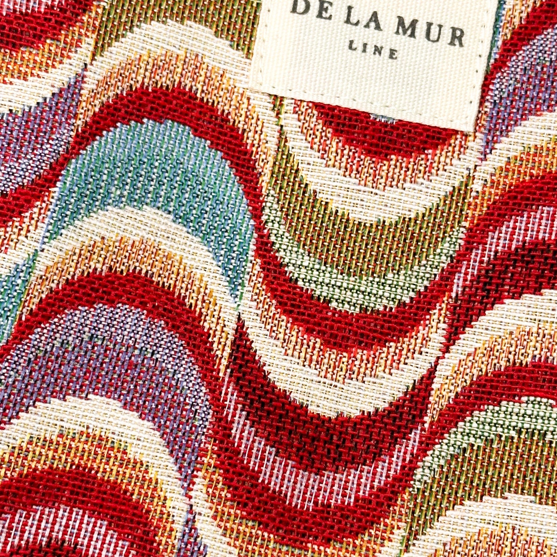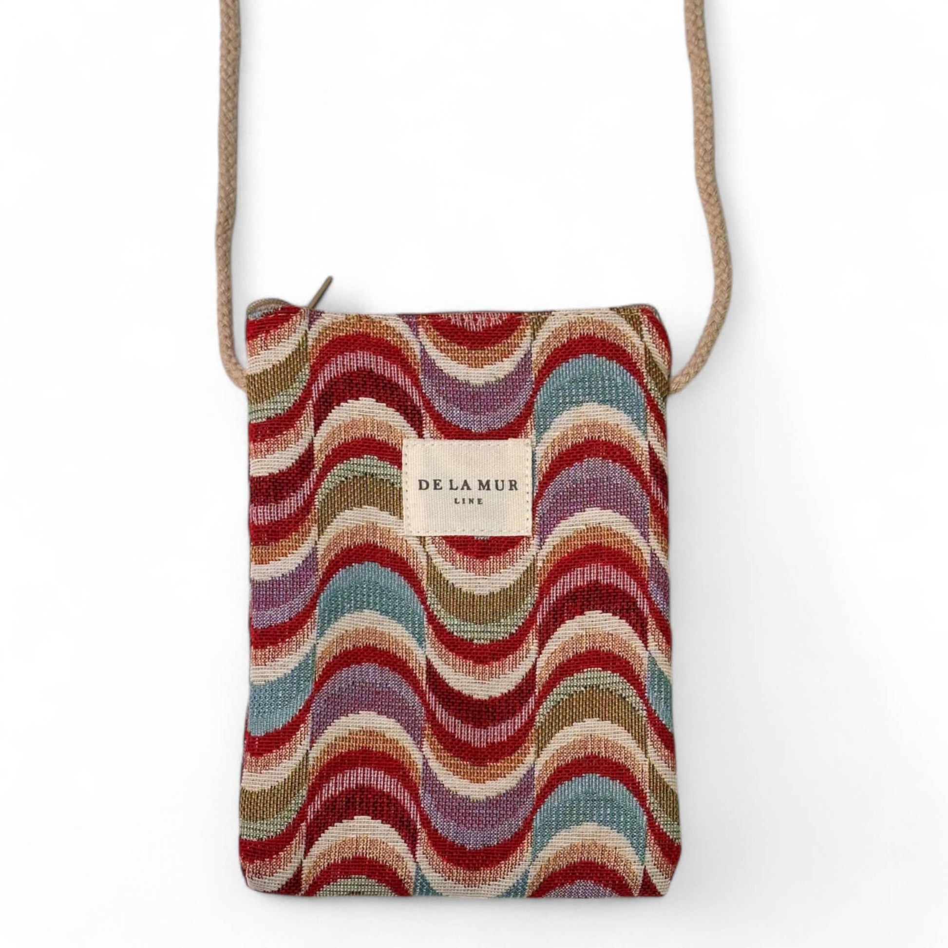 Mobile phone holder to wear as a crossbody. Zipper on the top and a long beige cotton cord. Made from thick jacquard fabric with a multicolor geometric pattern. Each item may have a variation in the pattern depending on where the piece is cut. Lined with thick gray fabric on the inside.