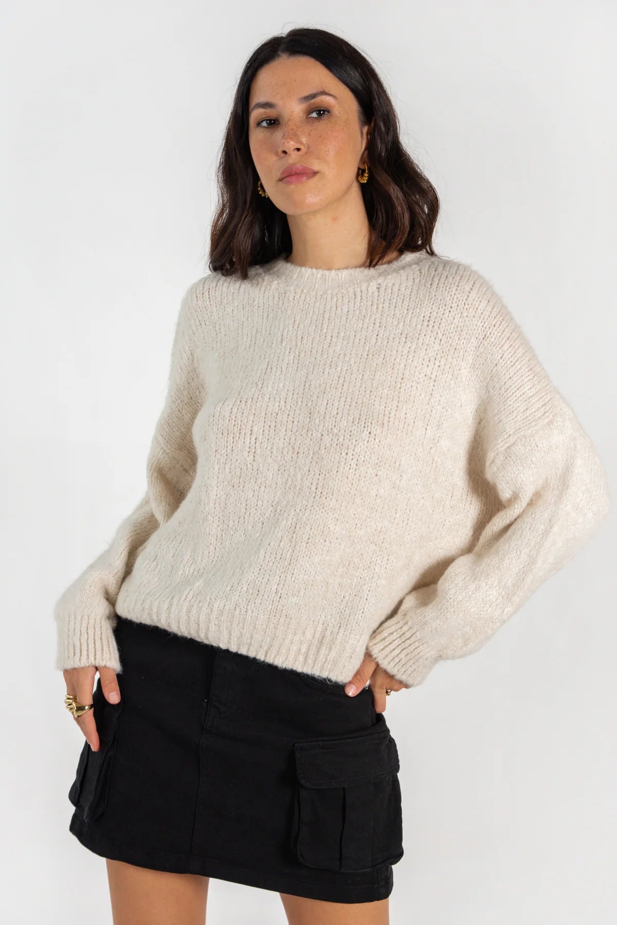 Ultra-soft knit sweater in ecru. It features a straight, loose fit and long sleeves with elastic at each cuff.