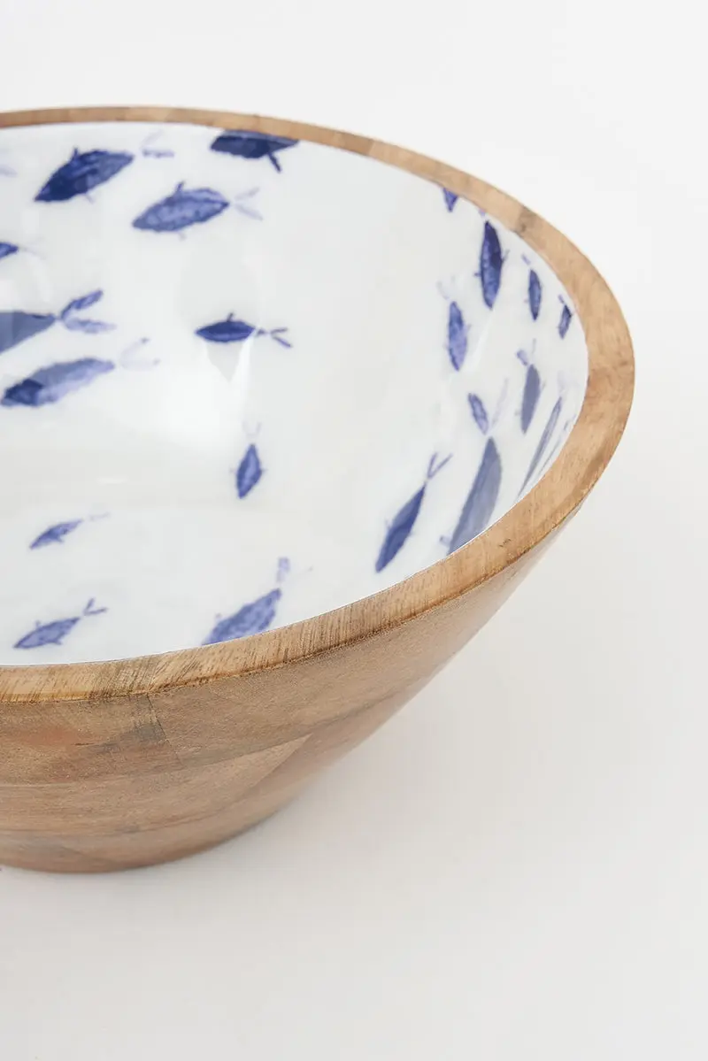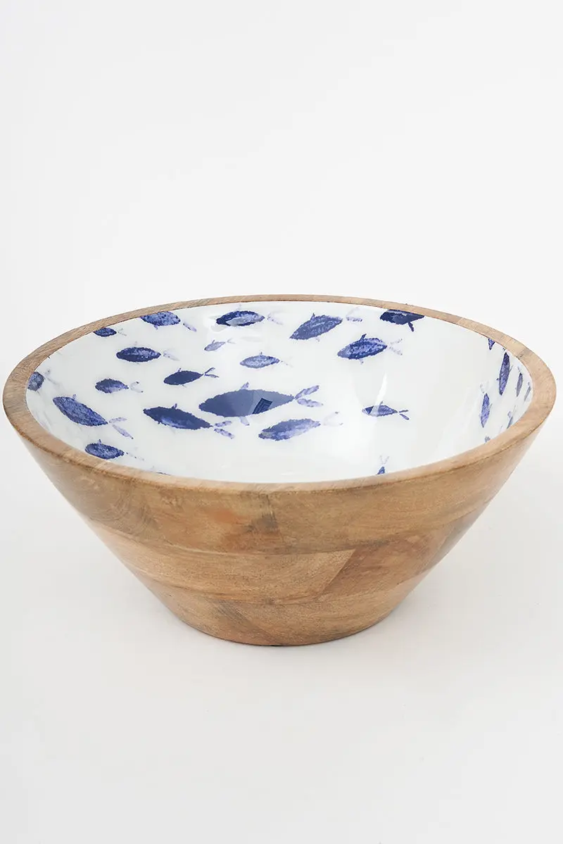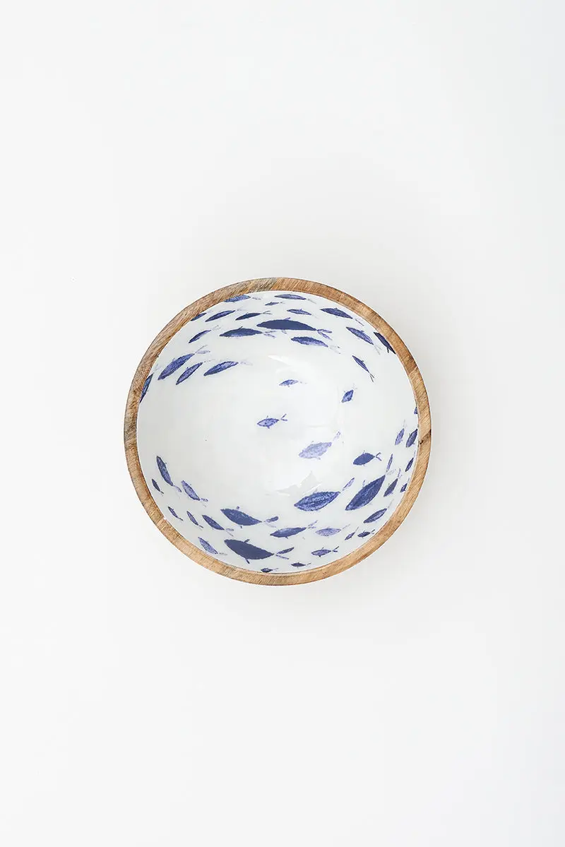 Wooden bowl whose inner part is painted in white and has a bank of fish painted in blue. The inner part is enameled. A perfect nautical gift.