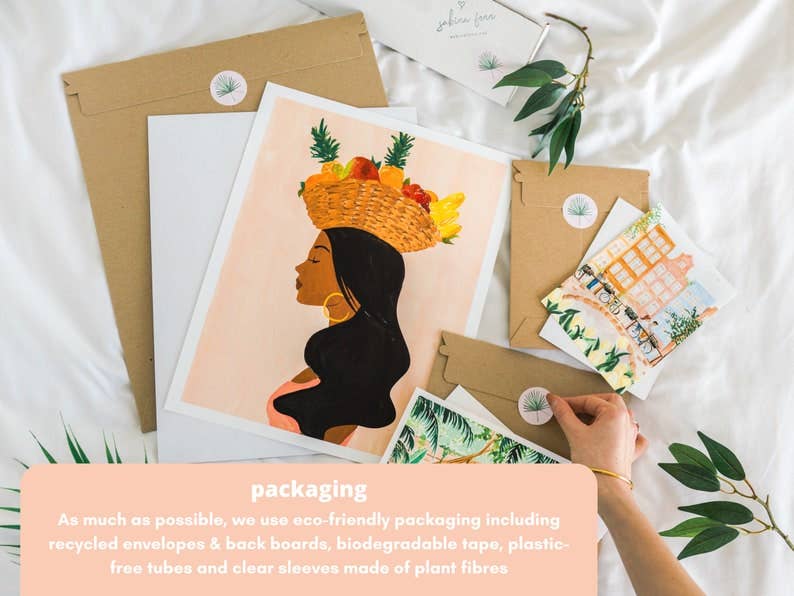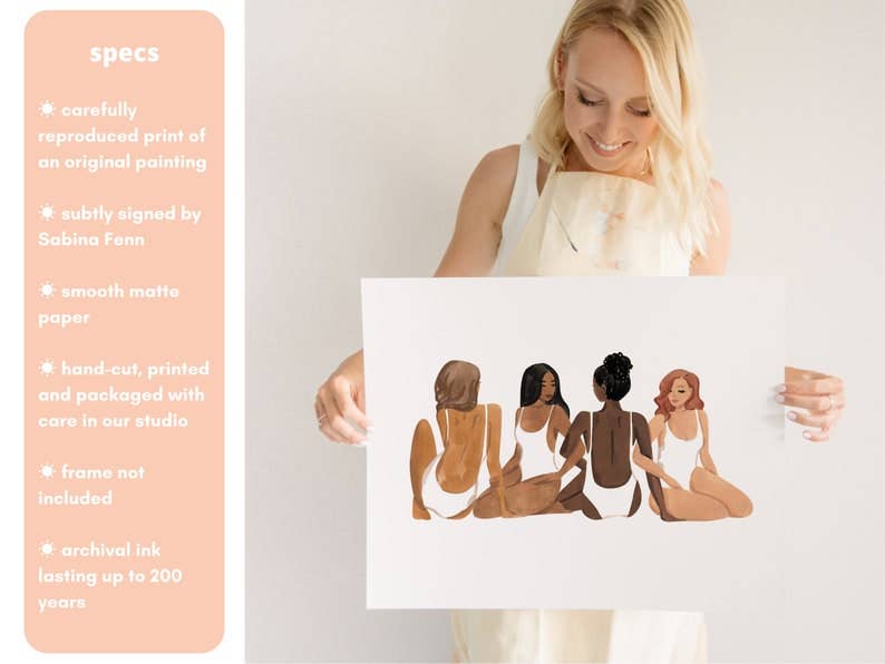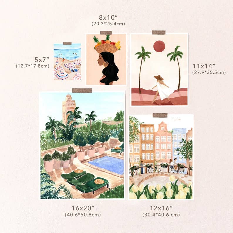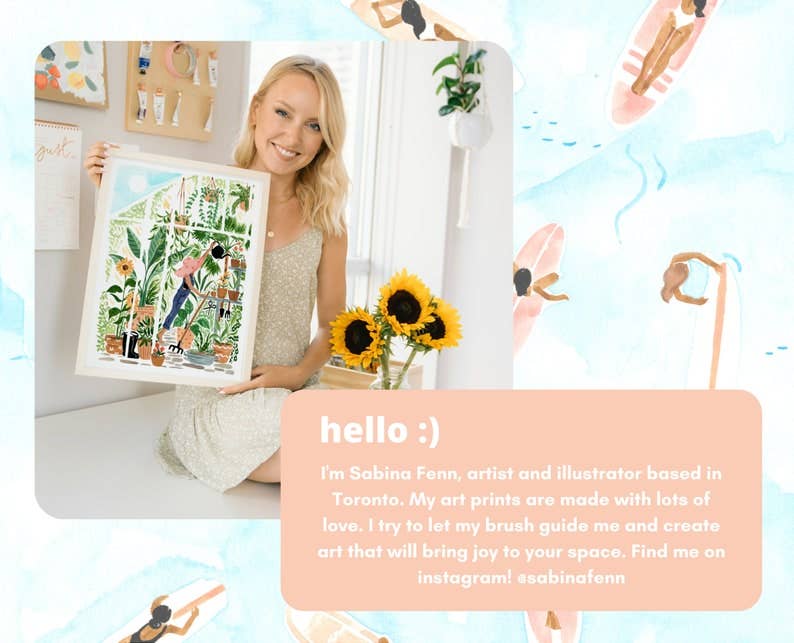 It makes a great gift and fits well into any color scheme! Our print designs are hand painted by Sabina Fenn using gouache and watercolor mediums. Sabina finds inspiration in the warmth of summers and tranquil moments in daily life. Her unique femme-chic approach to illustration makes for peaceful, vibrant and lush artwork.