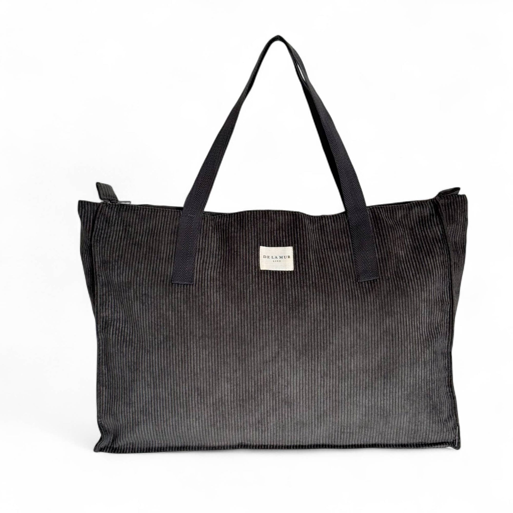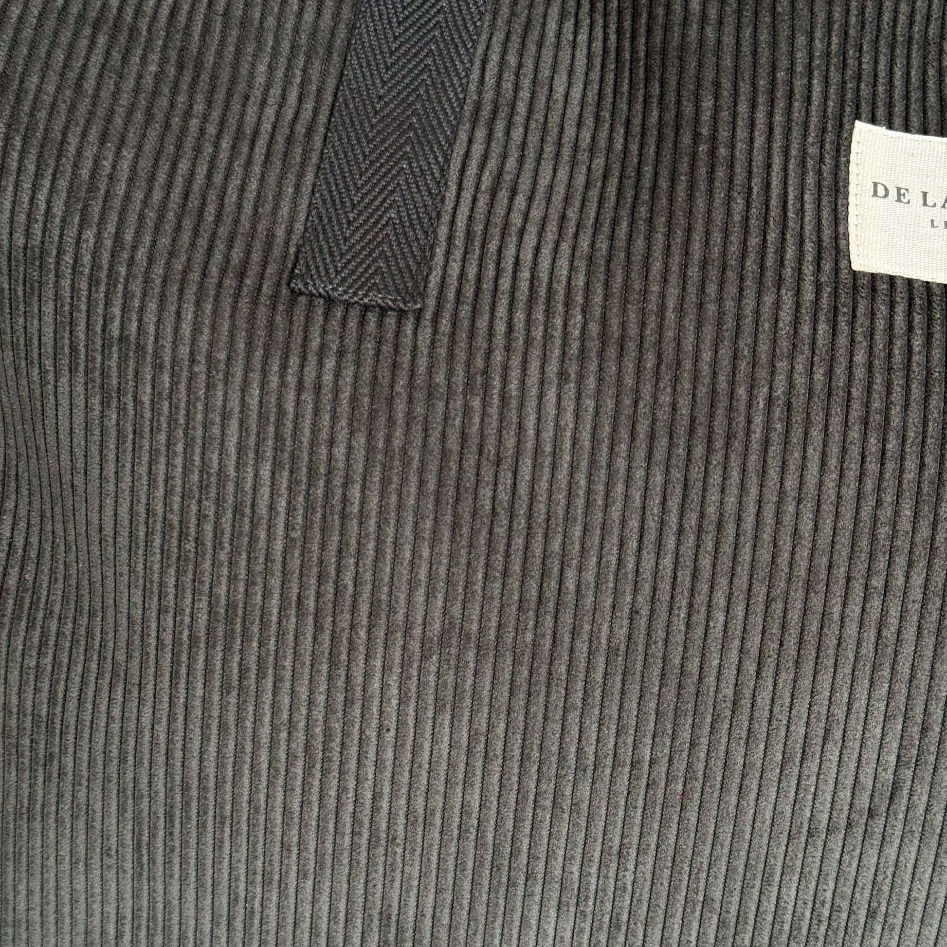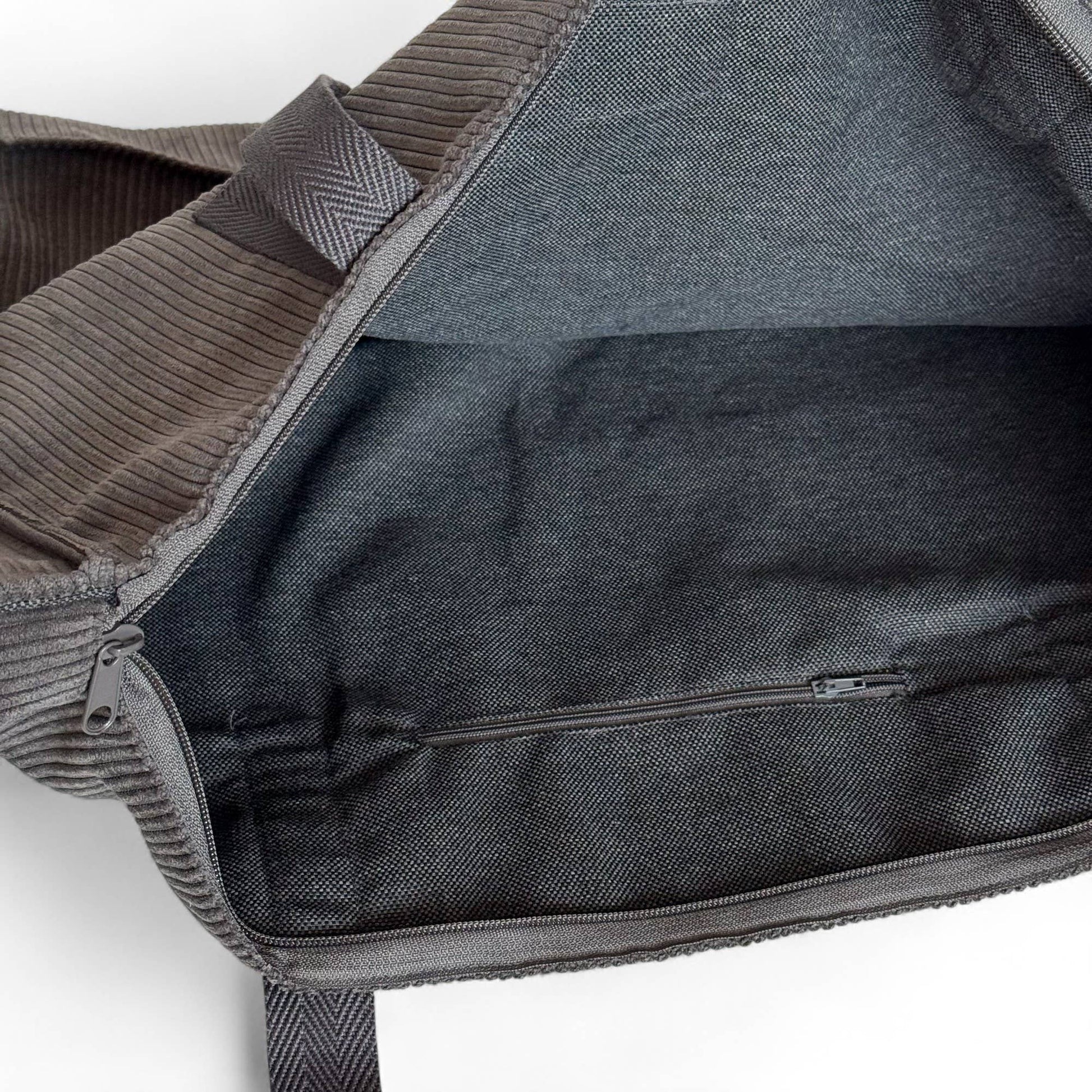 Weekend bag with medium-length handles made of dark gray cotton herringbone tape. Made of thick dark gray corduroy fabric. Interior zippered pocket. Lined with thick gray fabric on the inside.