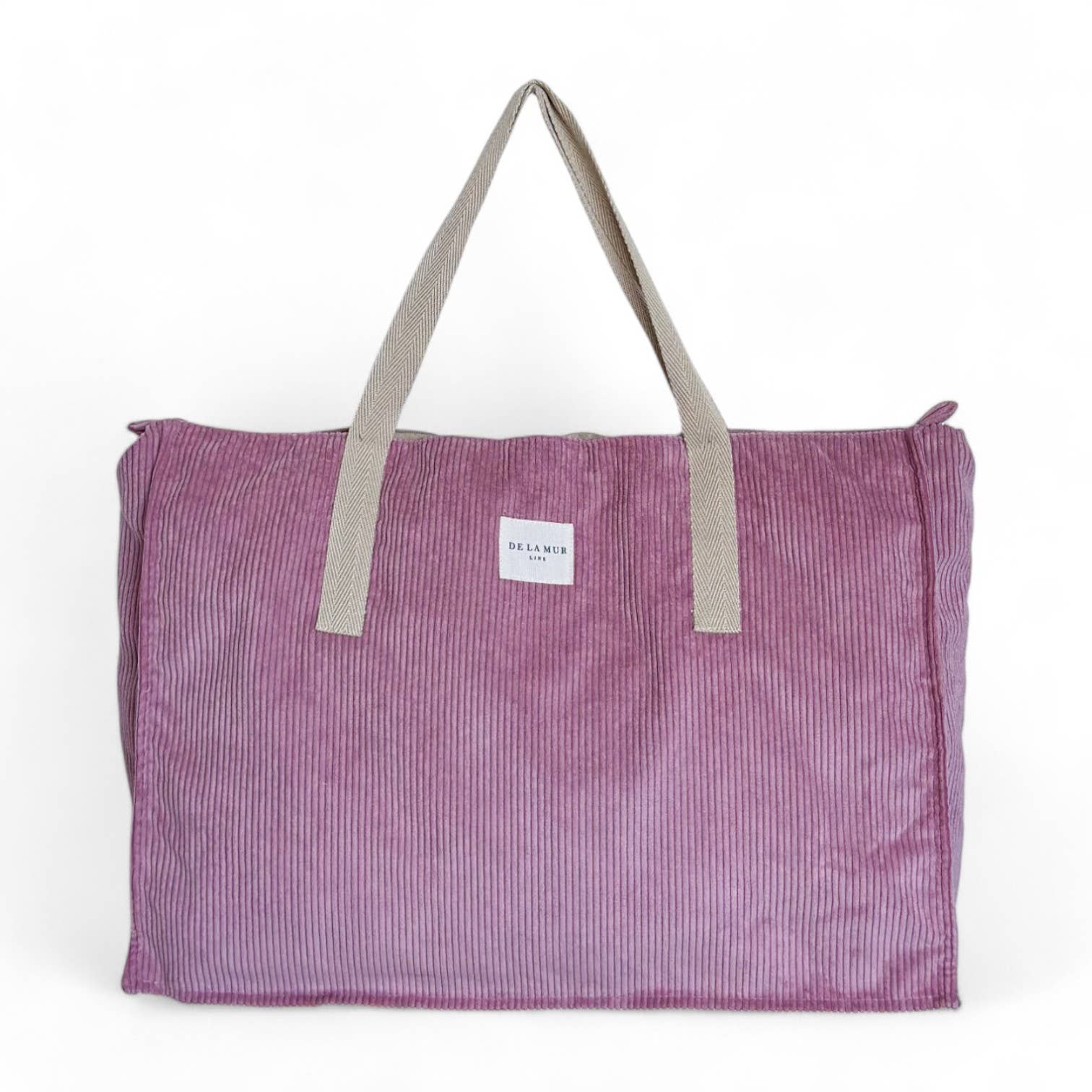 Weekend bag with medium handles at the top made of beige cotton tape. Made of thick pink corduroy fabric. Top zipper closure. Interior pocket with a zipper. Lined with thick gray fabric inside.