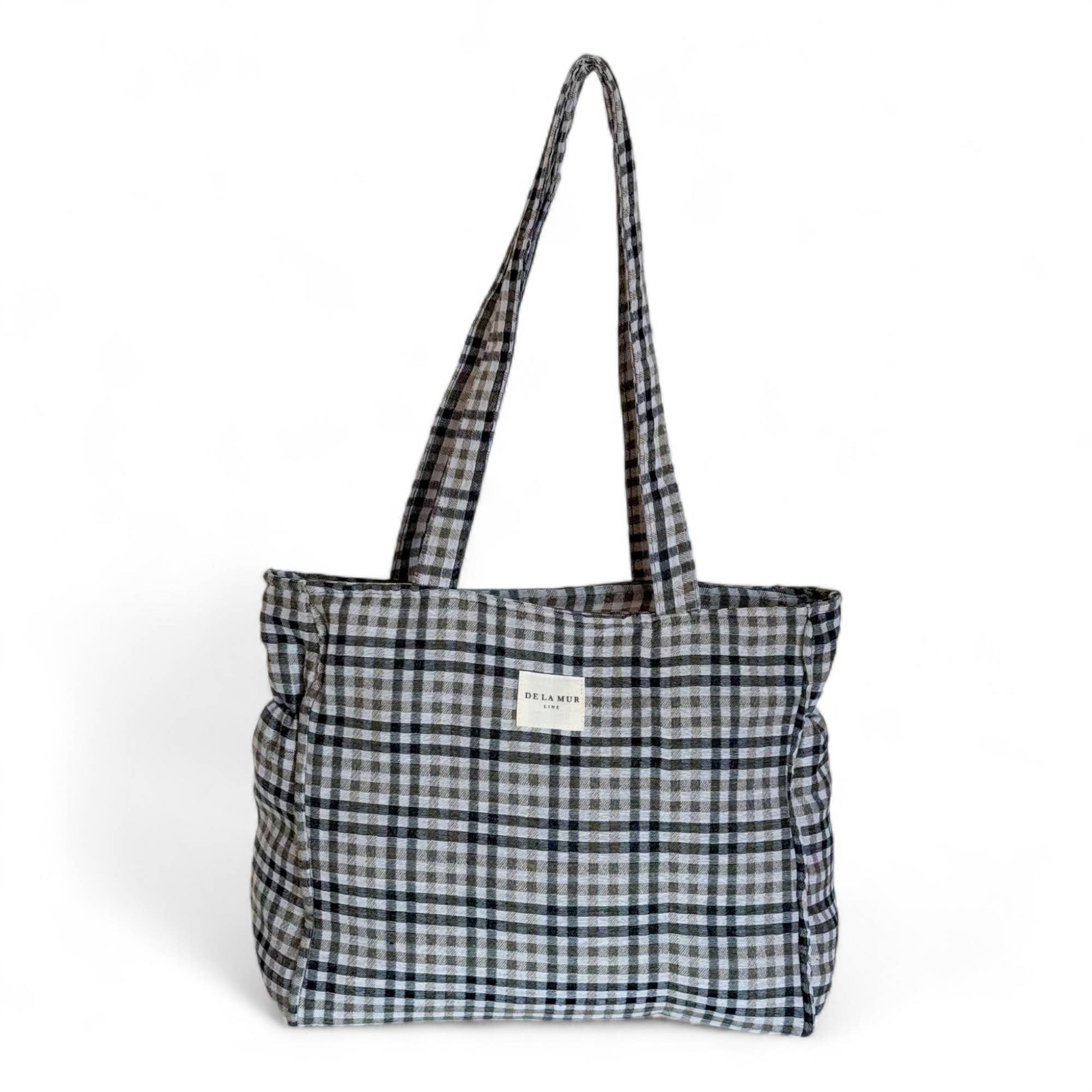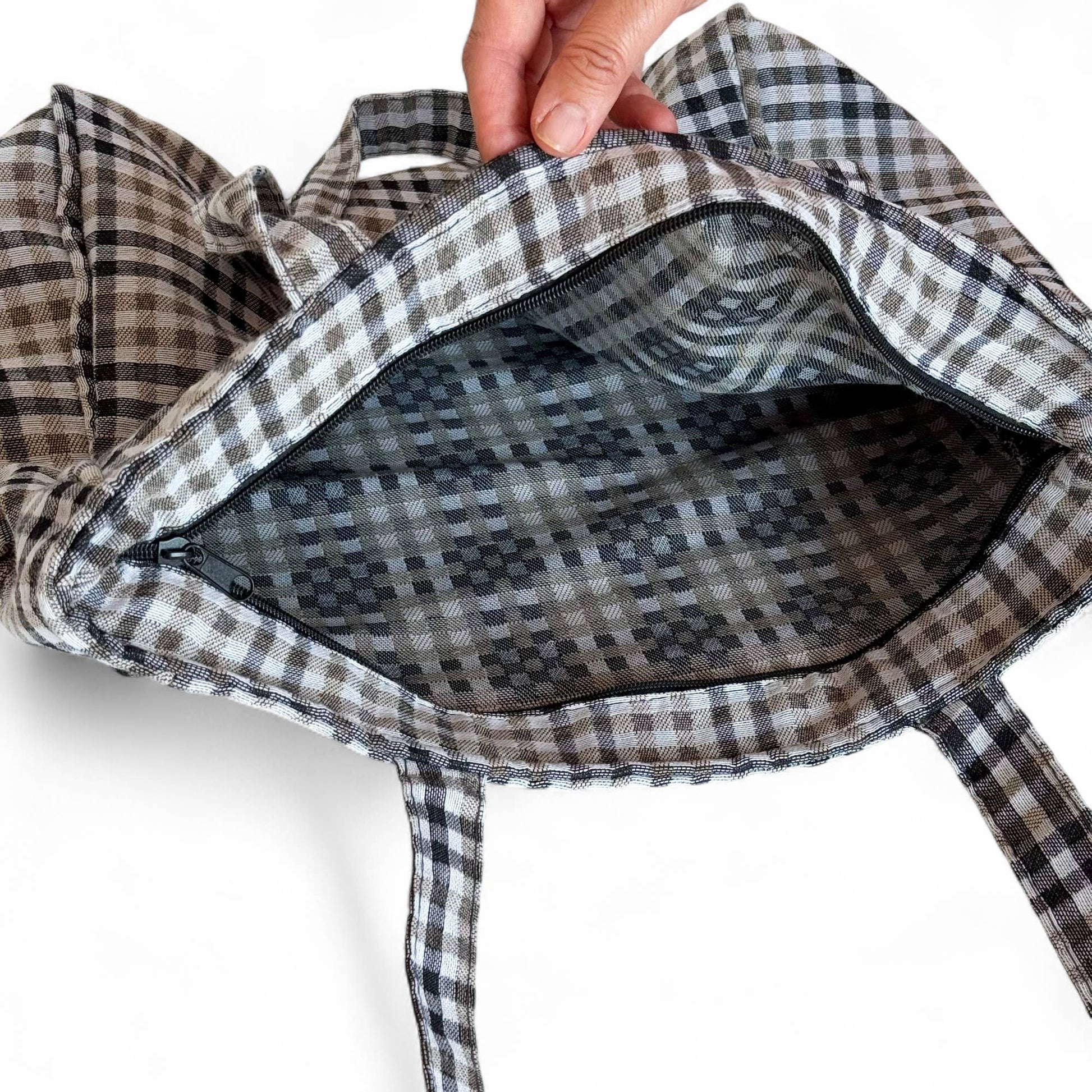 Medium bag with a top zipper closure and shoulder straps. Features side pockets for extra storage. Made from thick jacquard fabric with a beige and black checkered pattern.