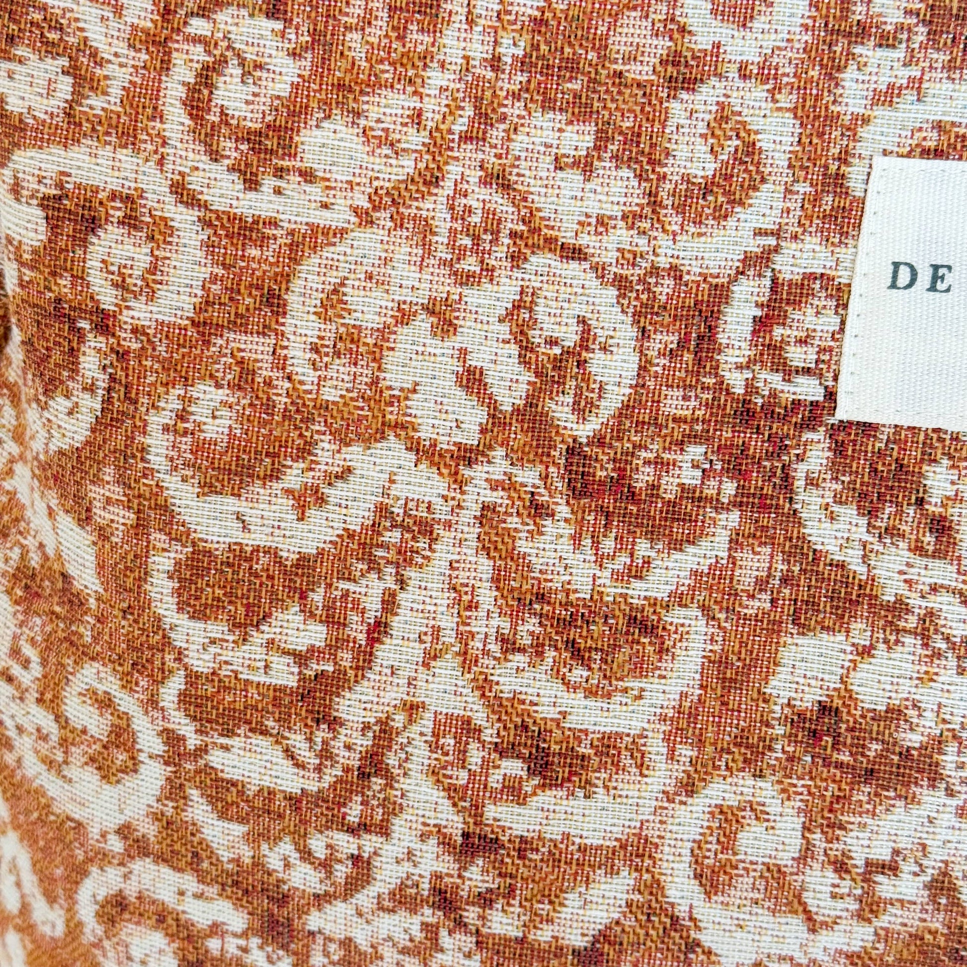 Medium bag with a top zipper closure and shoulder straps. Features side pockets for extra storage. Made from thick jacquard fabric with a geometric pattern in brick color.